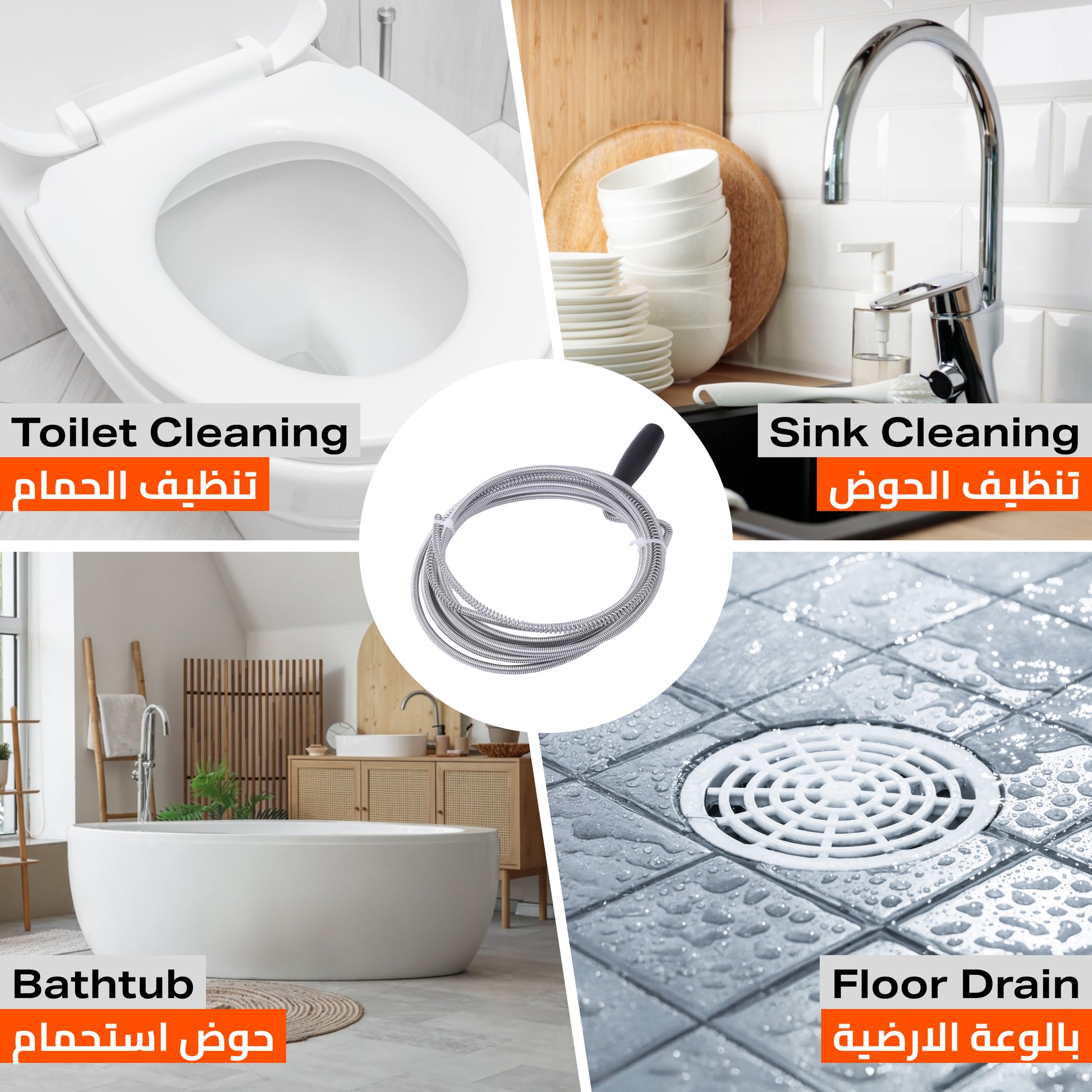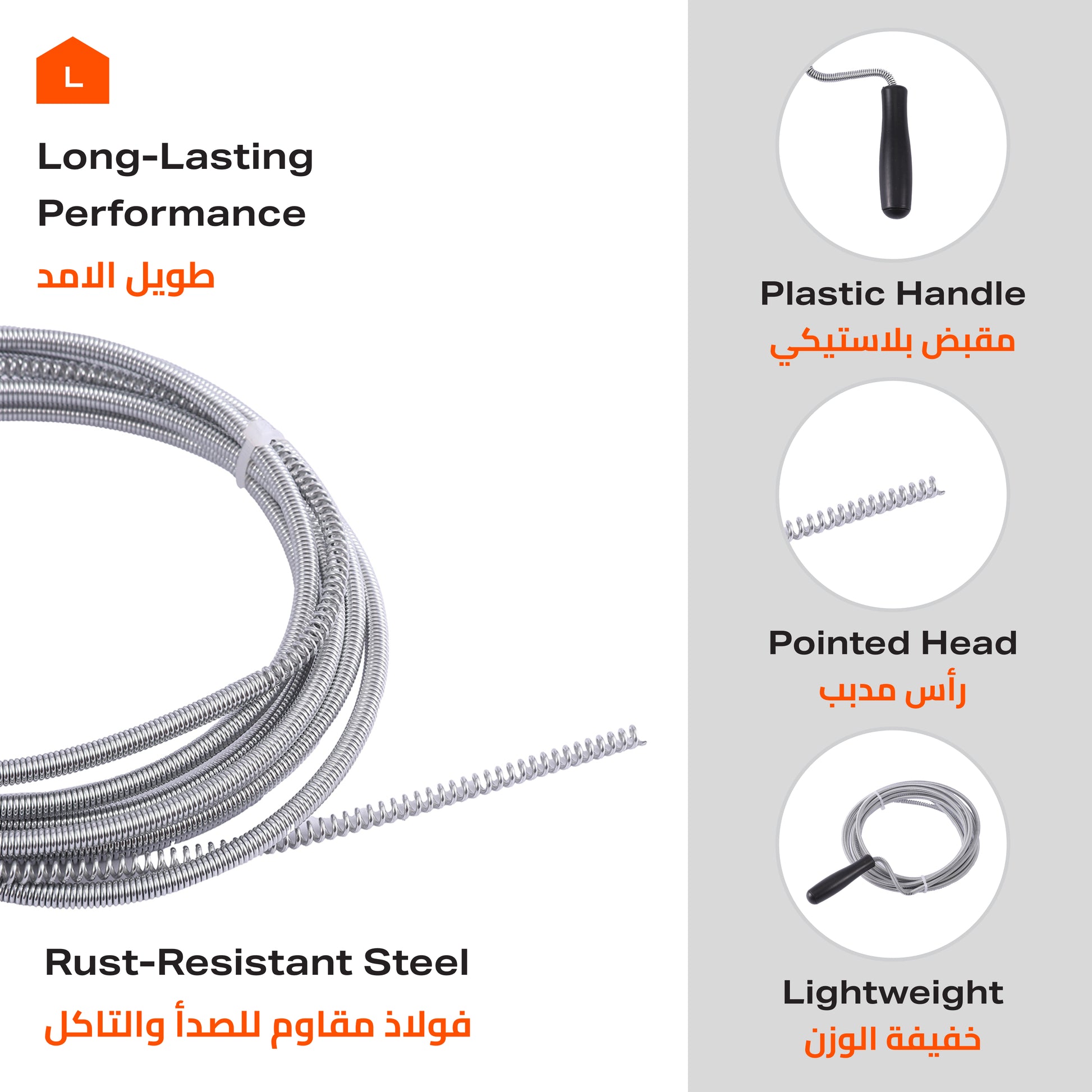 منظف المصارف - سلك بطول 5 أمتار، مزود بمسامير سباكة، مناسب للأحواض والمراحيض والدش وأحواض الاستحمام