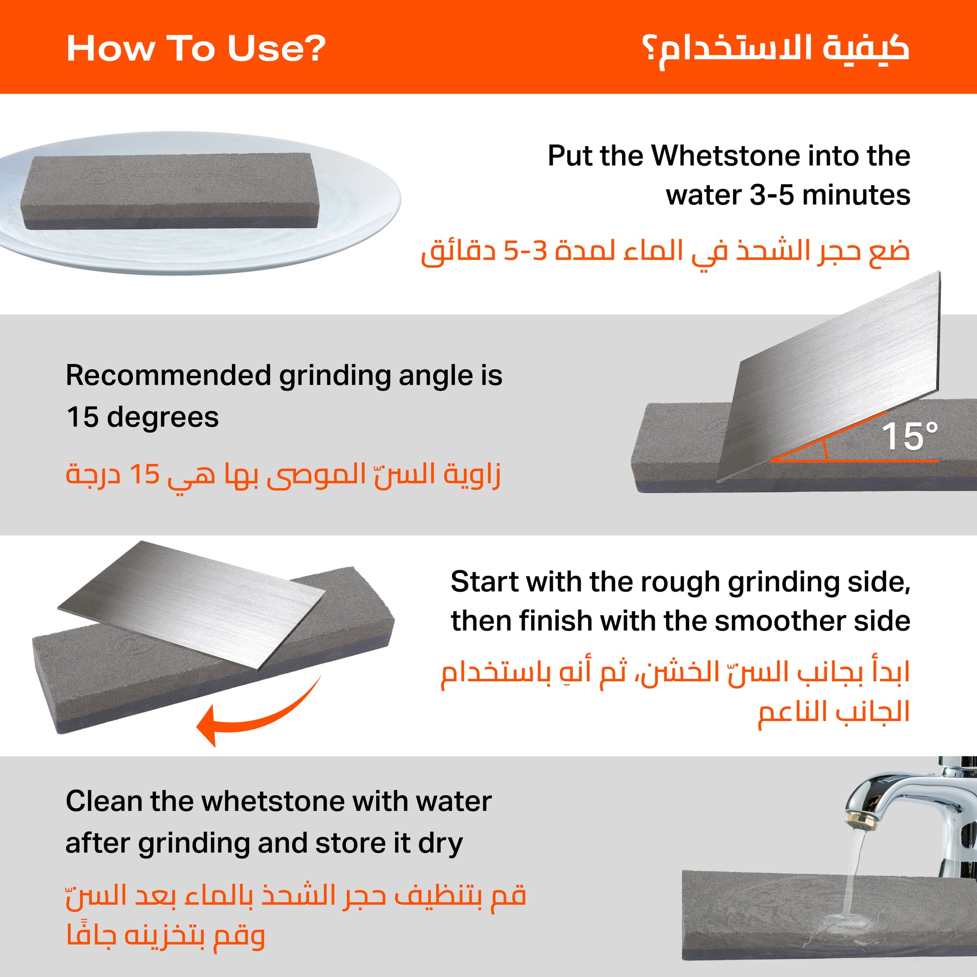 ✔️ [تشغيل بسيط] انقع الحجر في الماء لمدة 3-5 دقائق، ثم قم بشحذه بزاوية 15 درجة؛ استخدم الجانب الخشن أولاً، ثم الجانب الأكثر نعومة للحصول على حافة دقيقة.