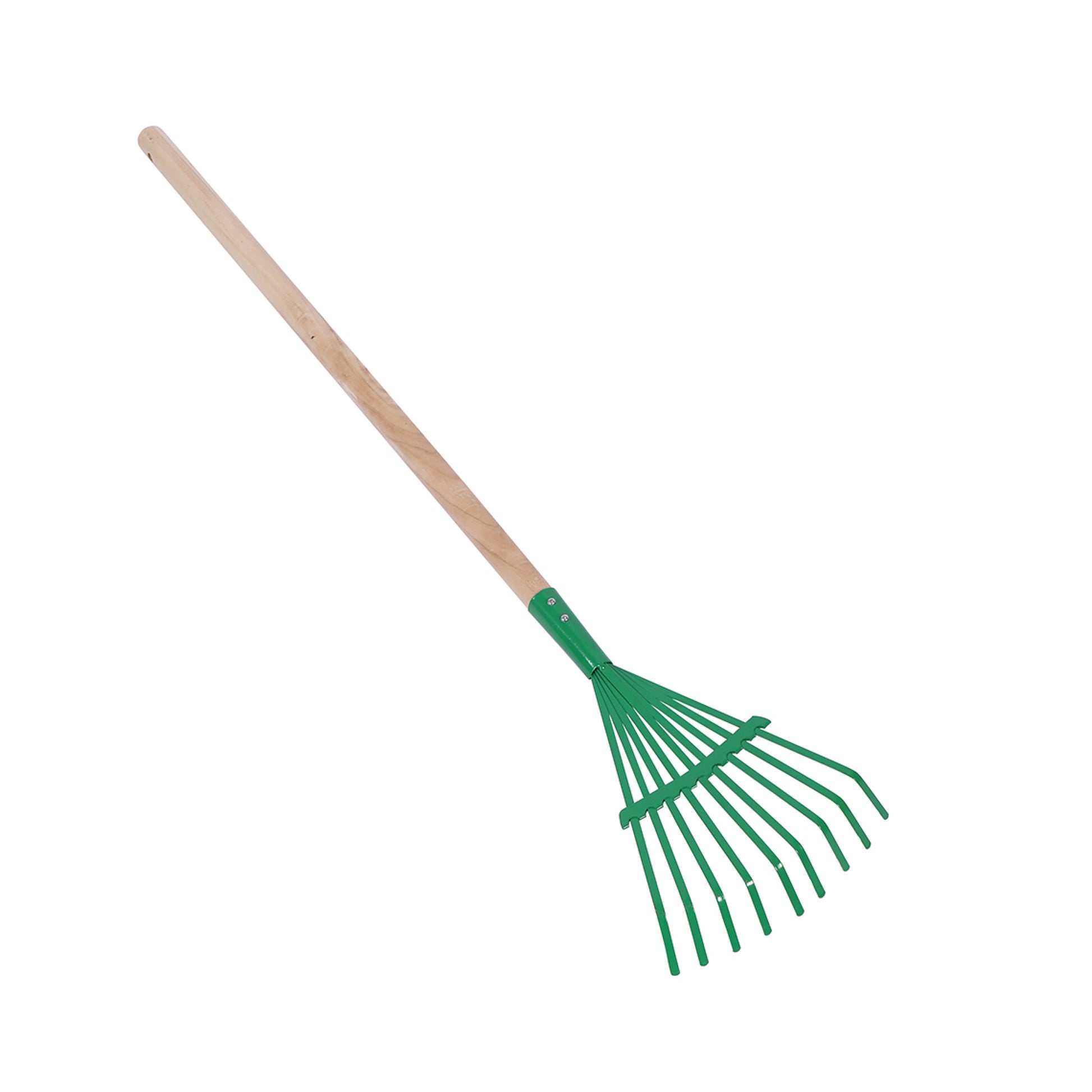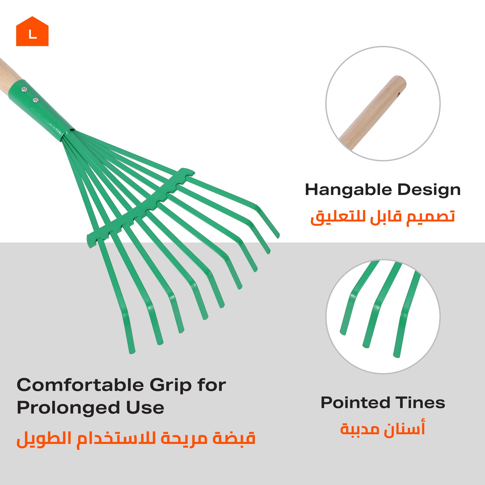 مشط بلاستيكي بمقبض خشبي - 9 أسنان خضراء لتنظيف الحدائق، وصيانة المروج، وجمع الأوراق، وإزالة الحطام الخارجي