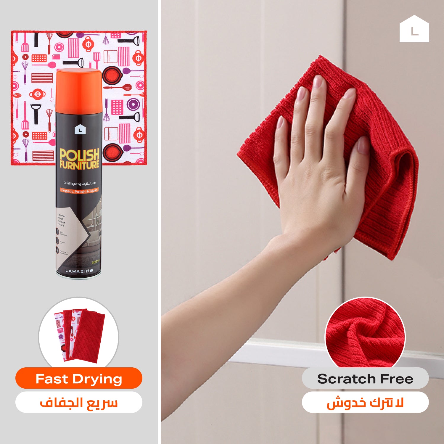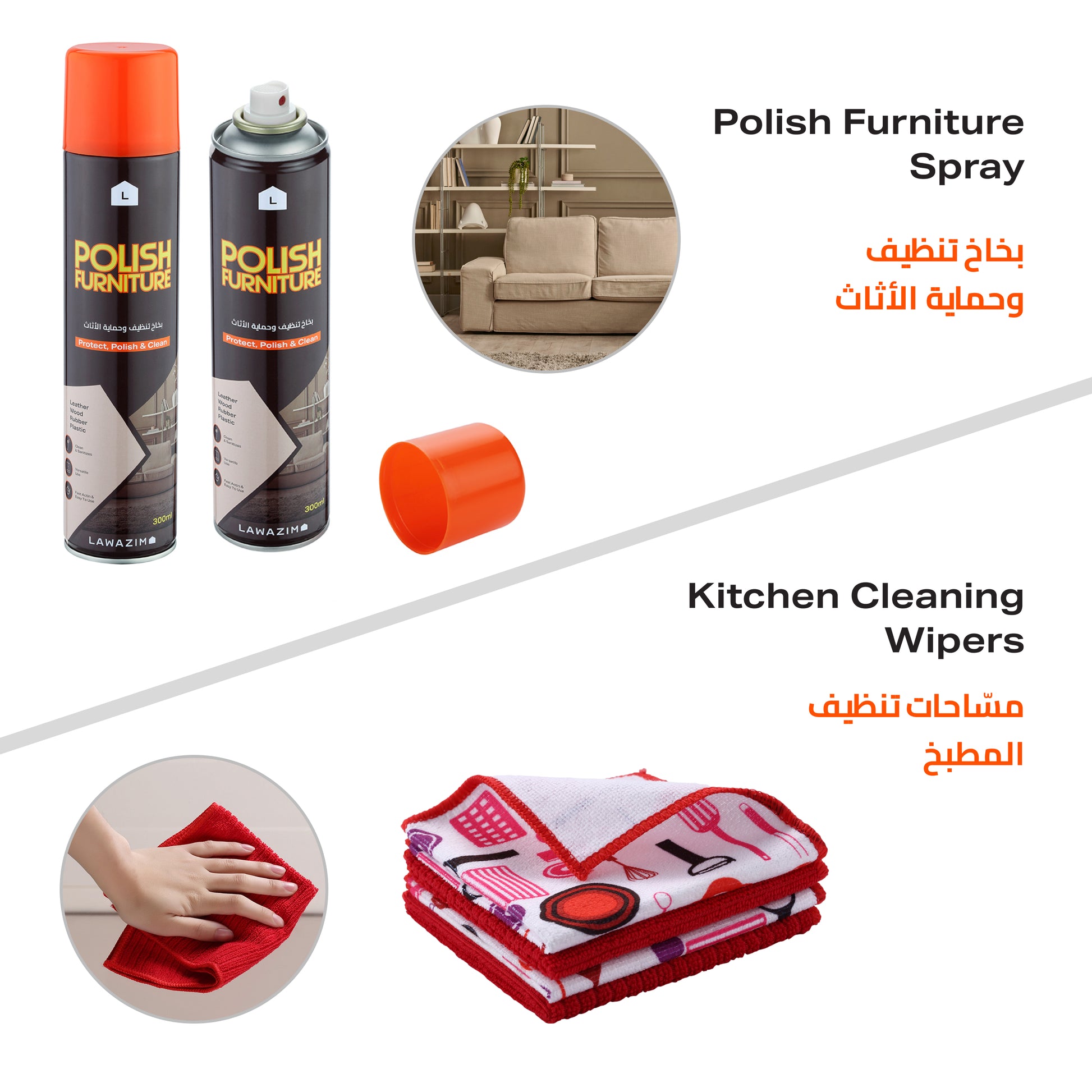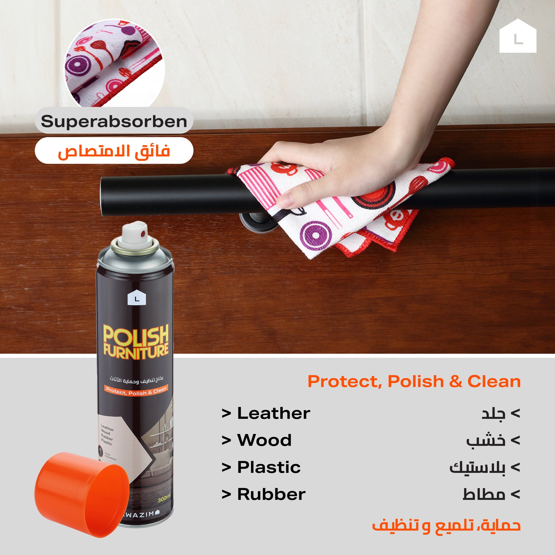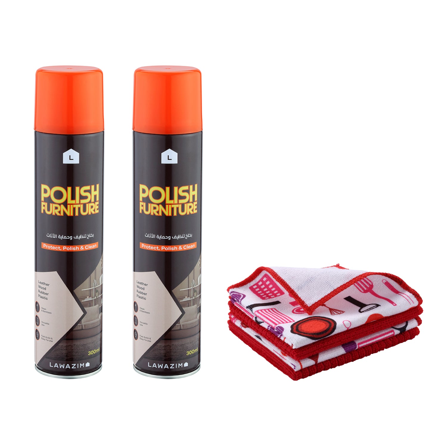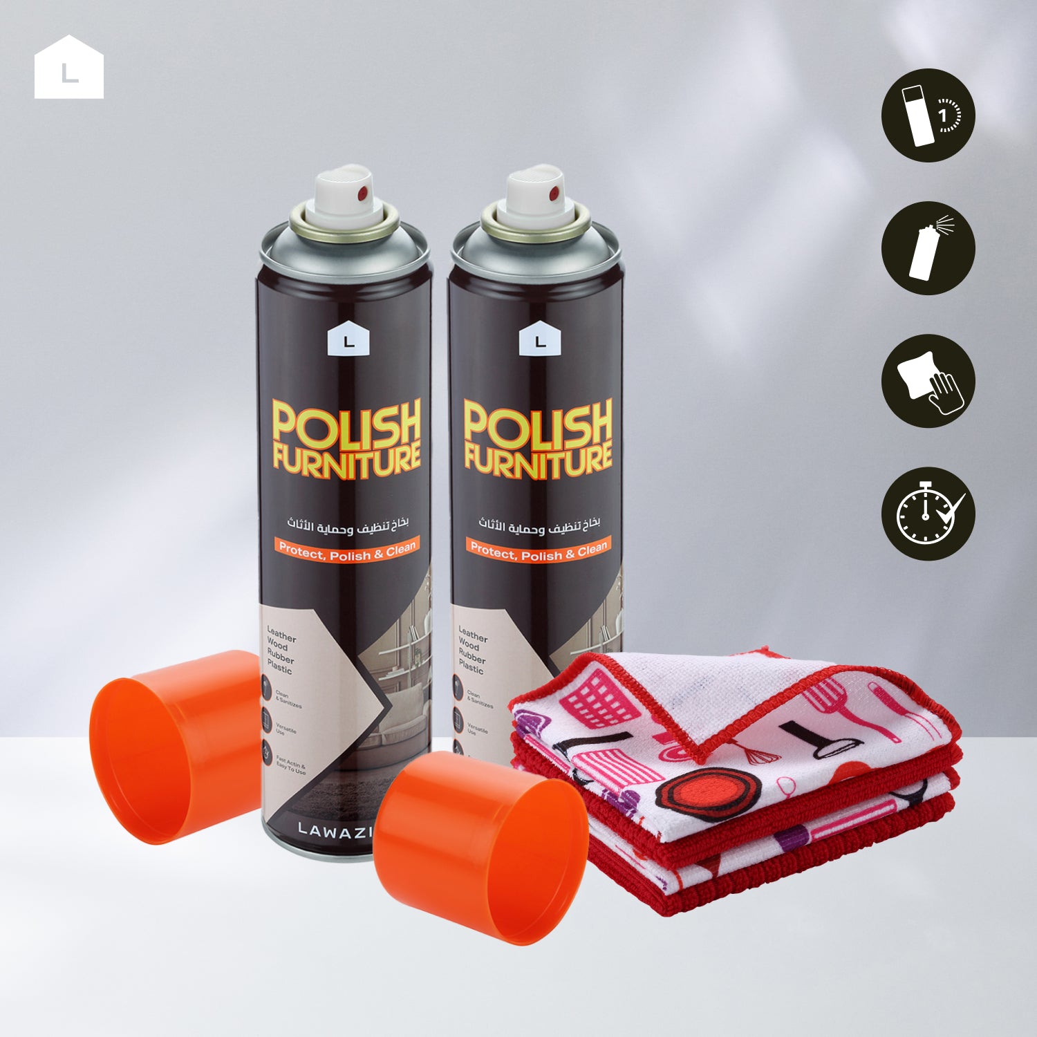 بخاخ تلميع الأثاث بتركيبة مائية - 2 بخاخ مع 4 قطع من مناشف المطبخ 30×30 سم - للجلد والخشب والبلاستيك