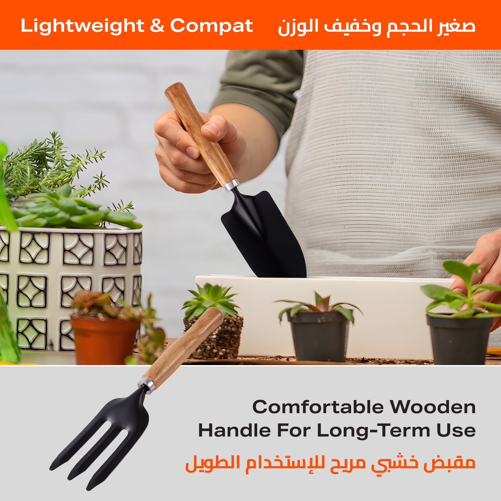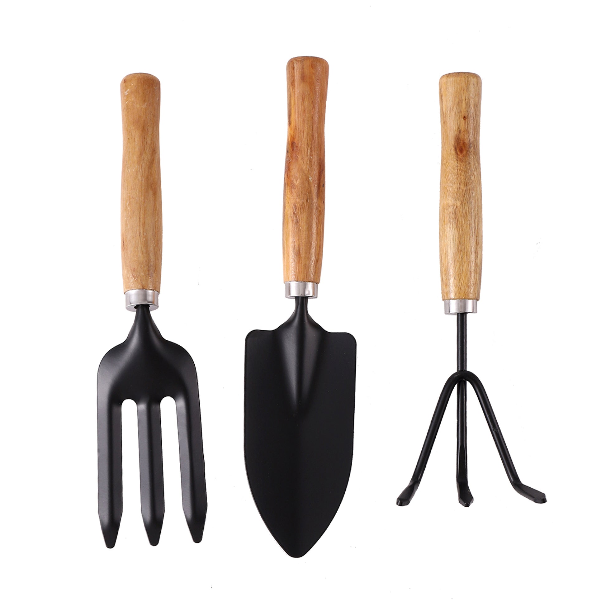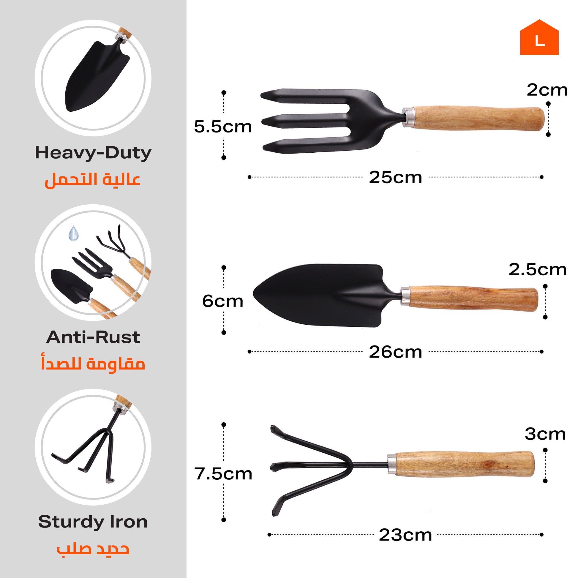 مجرفة بمقبض خشبي - 3 قطع - مجموعة أدوات يدوية للزراعة مع مجرفة يدوية وشوكة يدوية ومحراث - للزراعة وإزالة الأعشاب الضارة وزراعة التربة