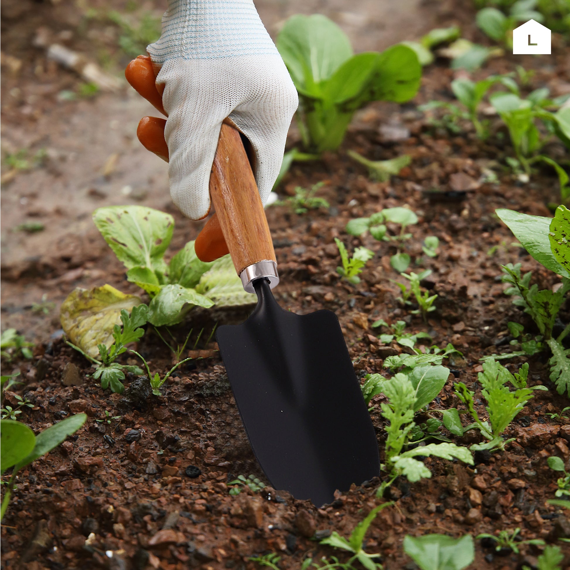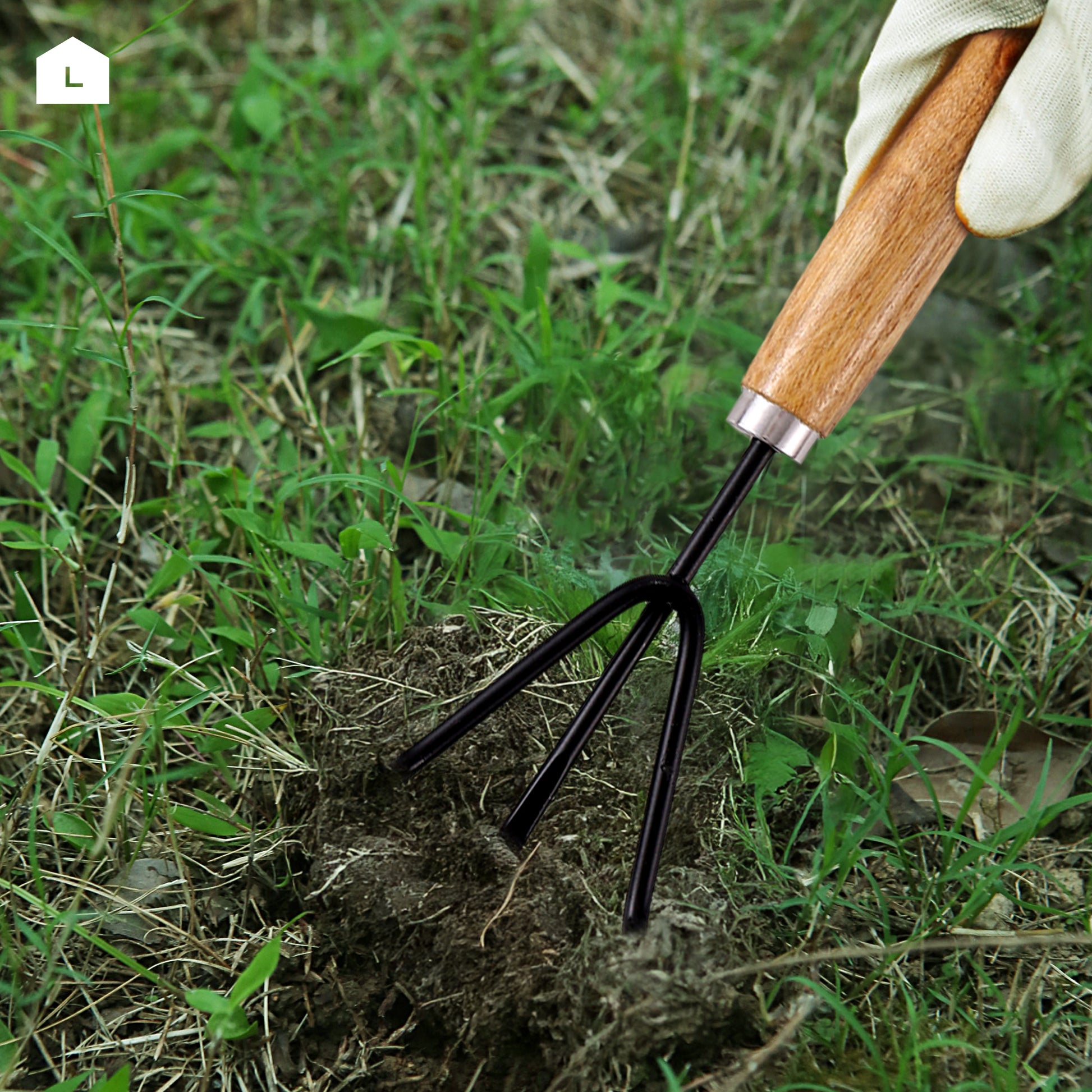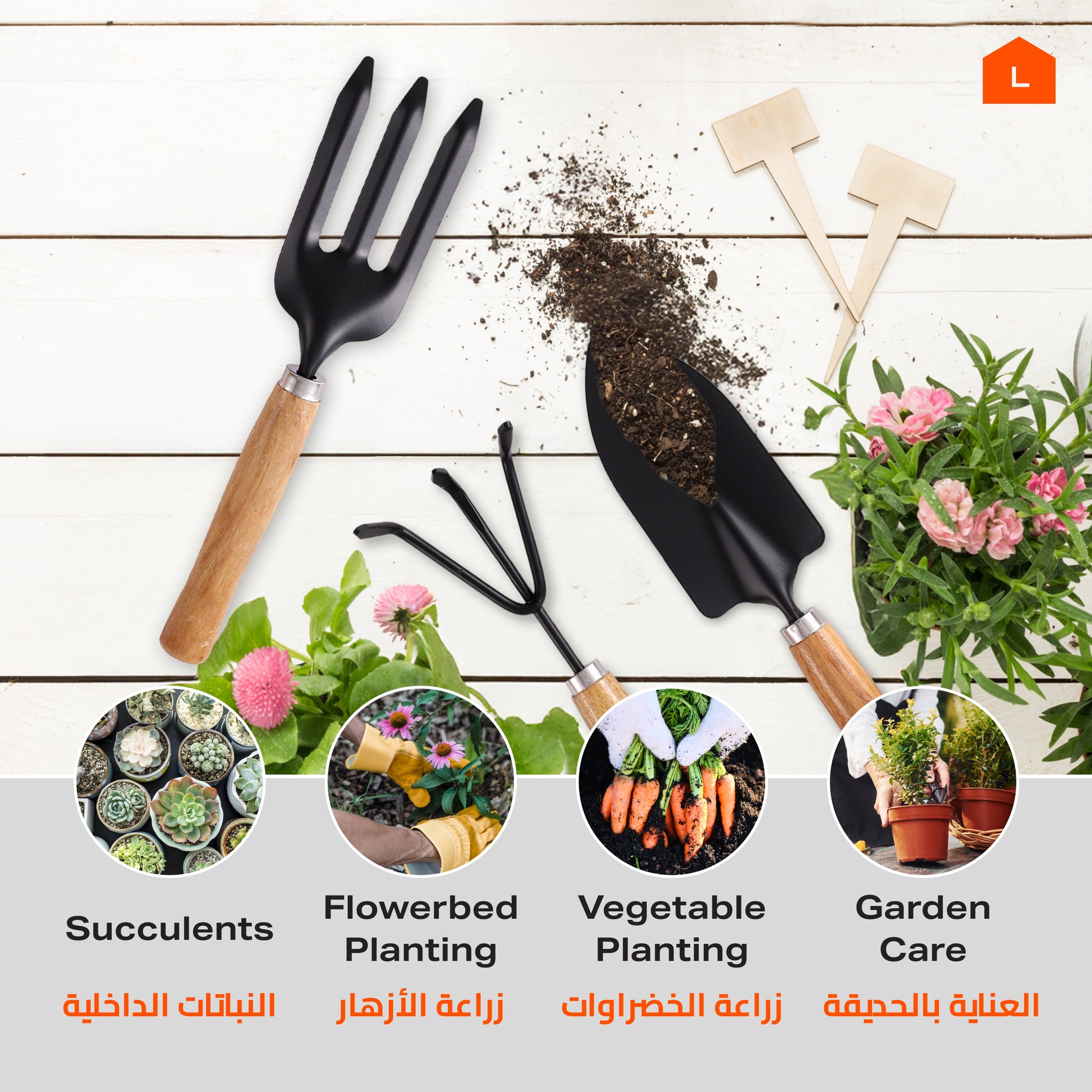 مجرفة بمقبض خشبي - 3 قطع - مجموعة أدوات يدوية للزراعة مع مجرفة يدوية وشوكة يدوية ومحراث - للزراعة وإزالة الأعشاب الضارة وزراعة التربة