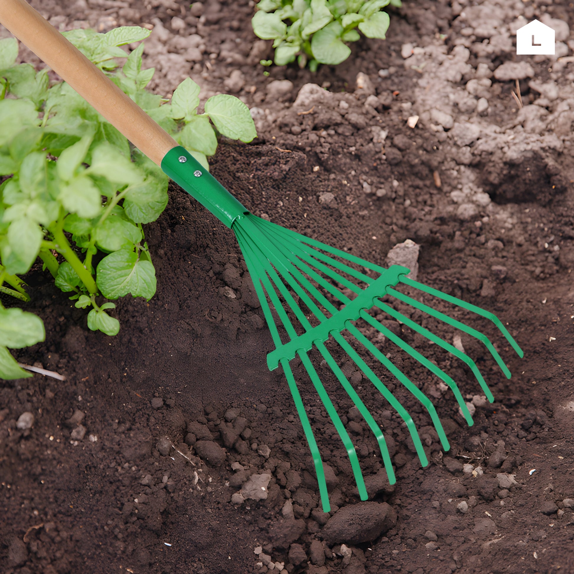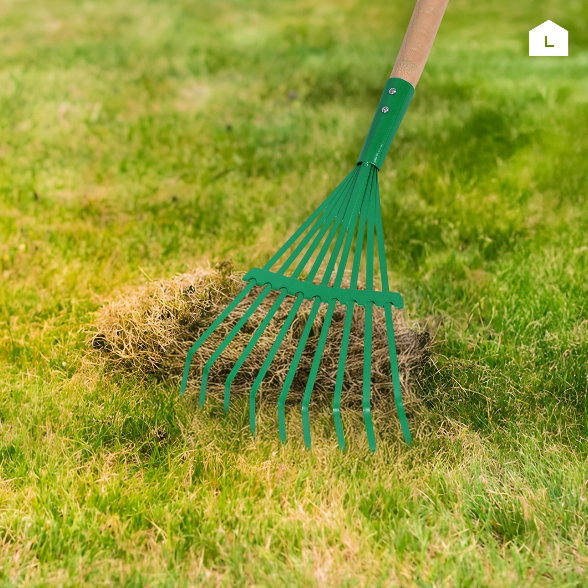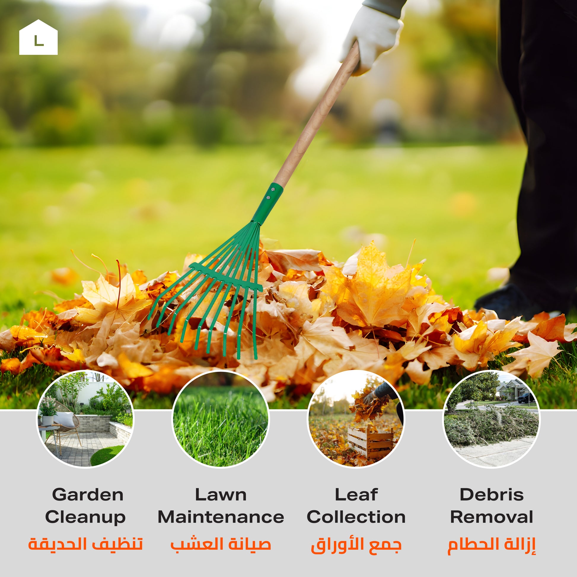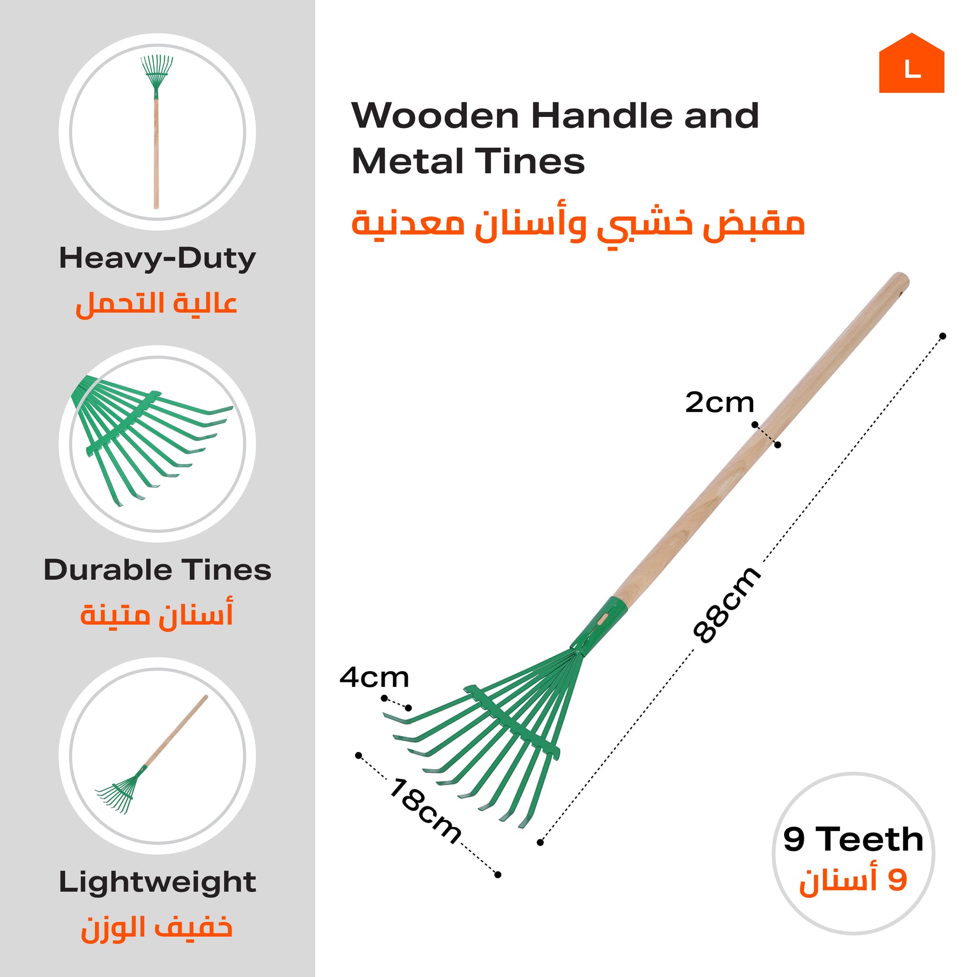 مشط بلاستيكي بمقبض خشبي - 9 أسنان خضراء لتنظيف الحدائق، وصيانة المروج، وجمع الأوراق، وإزالة الحطام الخارجي