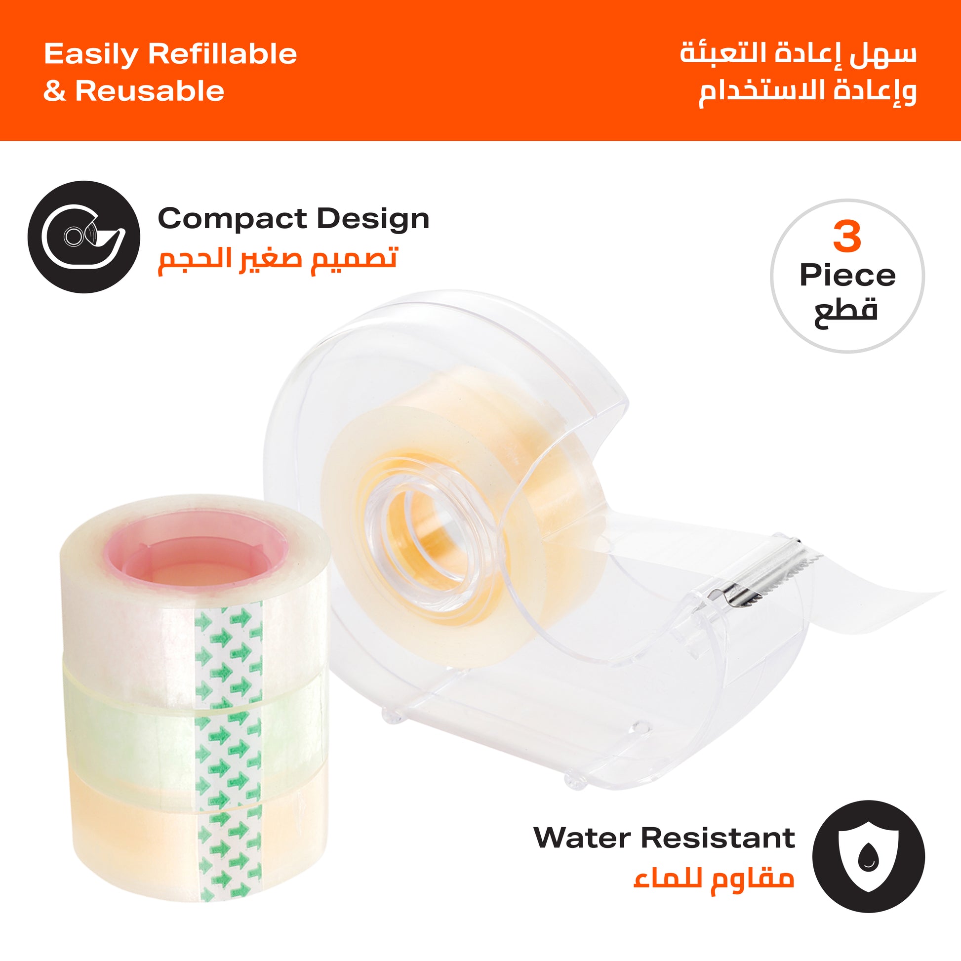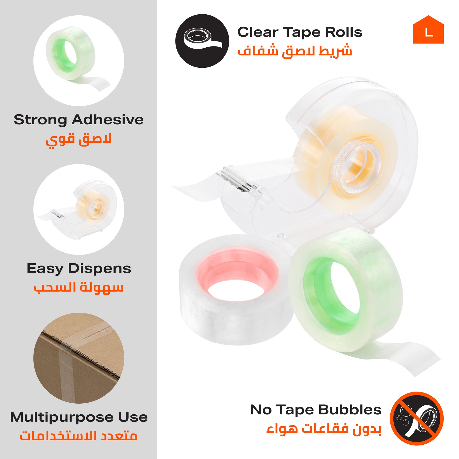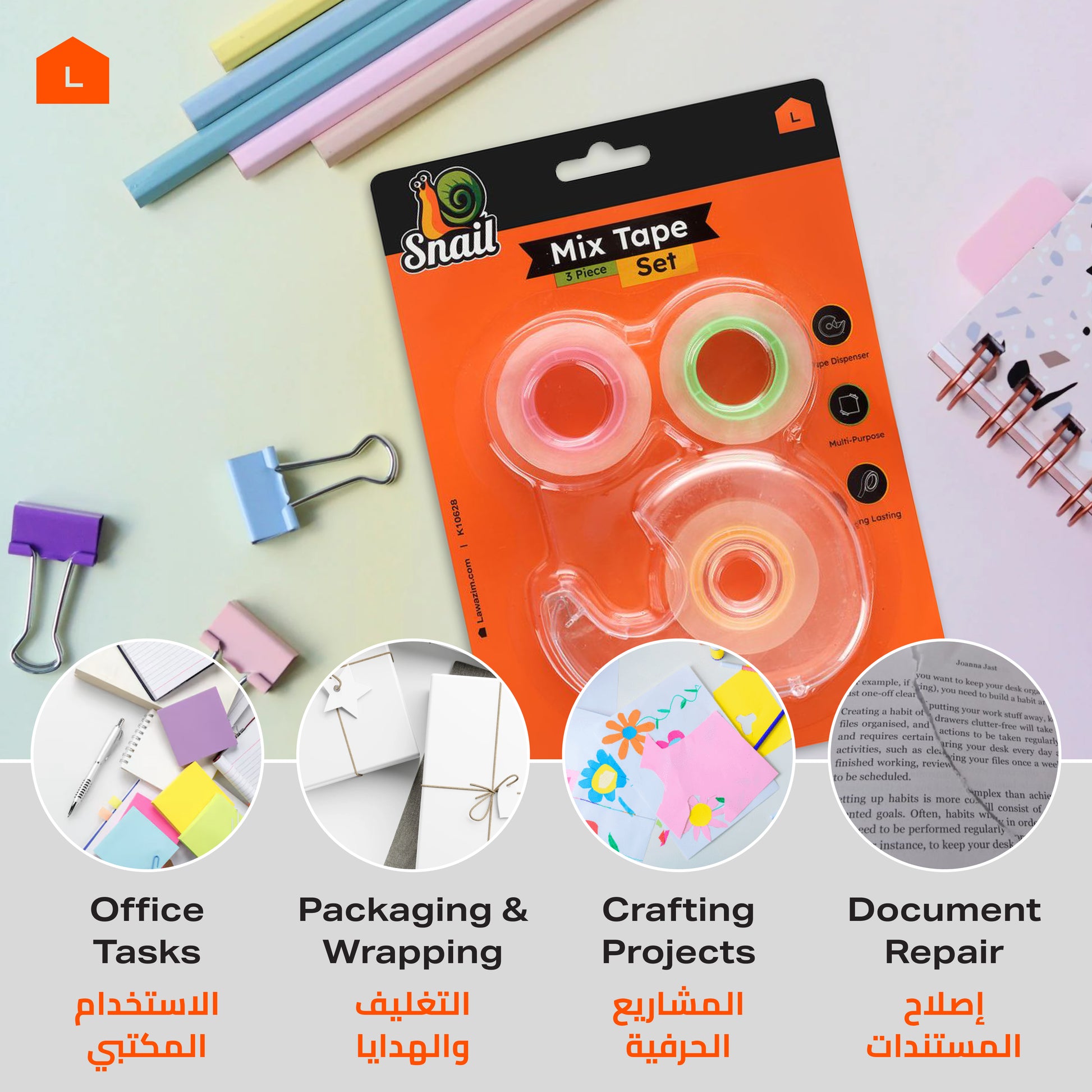 مجموعة شريط الحلزون المختلطة - 3 قطع - لفات شريط لاصق شفاف مع موزع، شريط قرطاسية متعدد الأغراض - للاستخدام في المكتب والمدرسة والمنزل