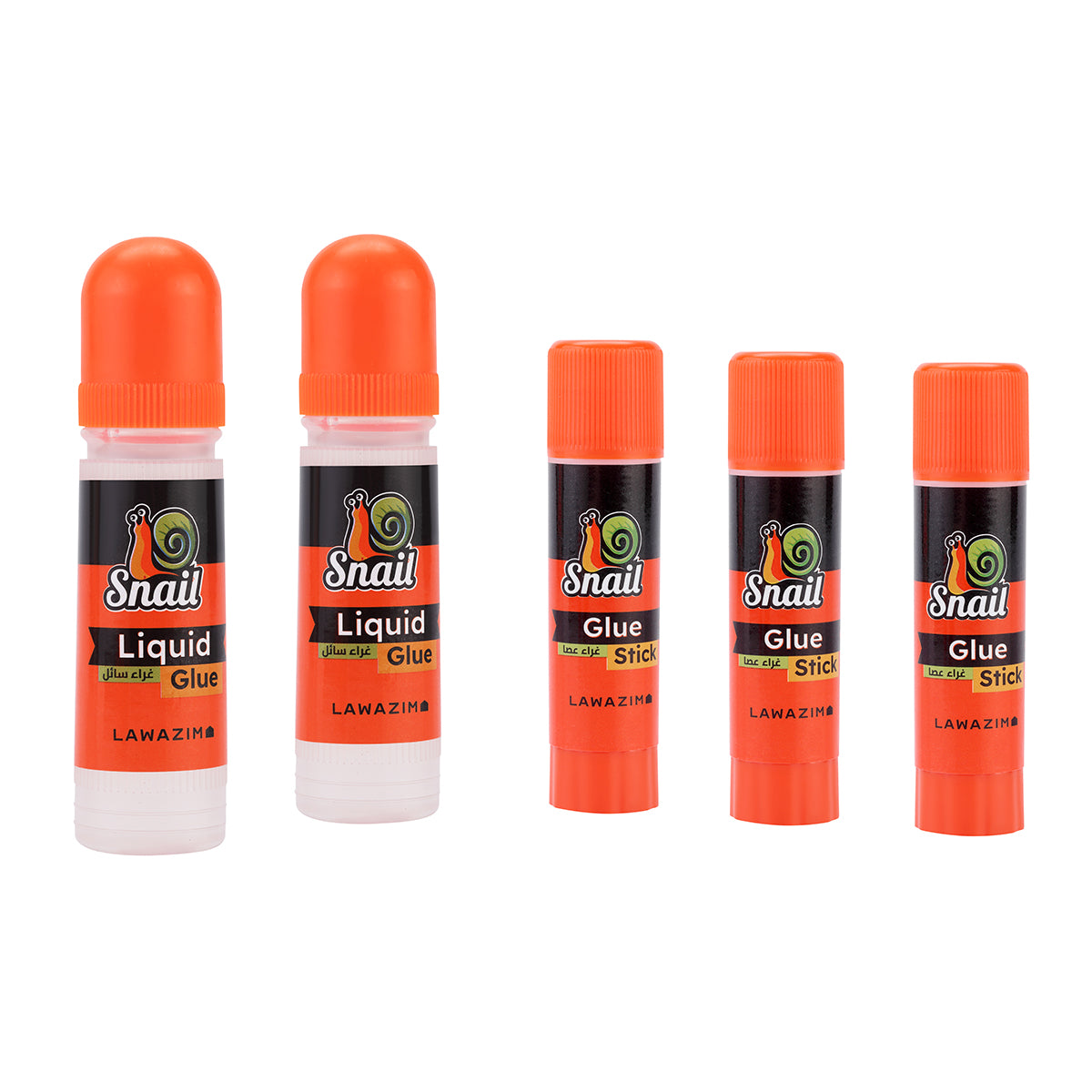 عصا غراء الحلزون - 5 قطع - تتضمن غراء سائل وعيدان غراء، لاصق سريع الجفاف للورق والبطاقات والحرف اليدوية، مثالي للاستخدام في المدرسة والمكتب والمنزل