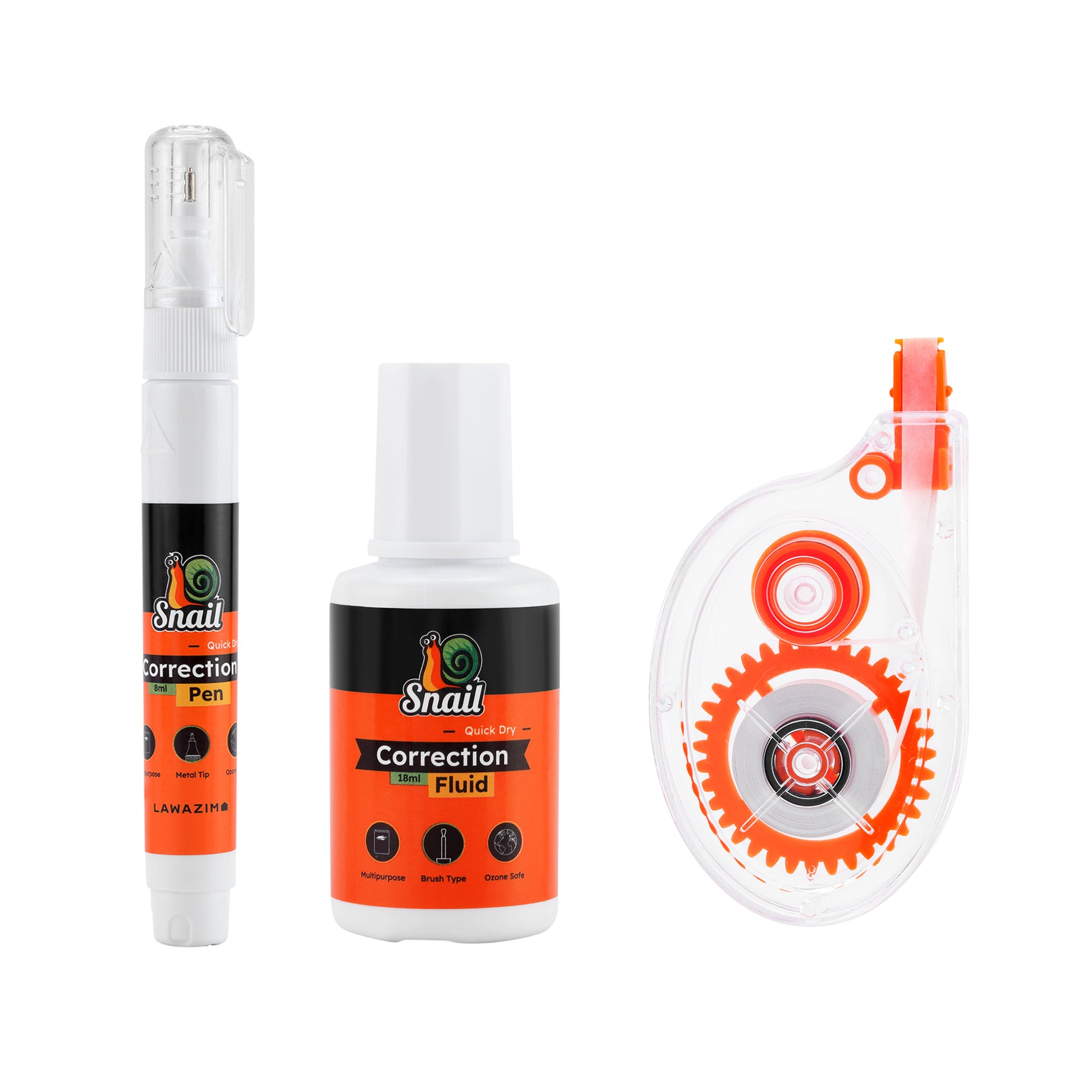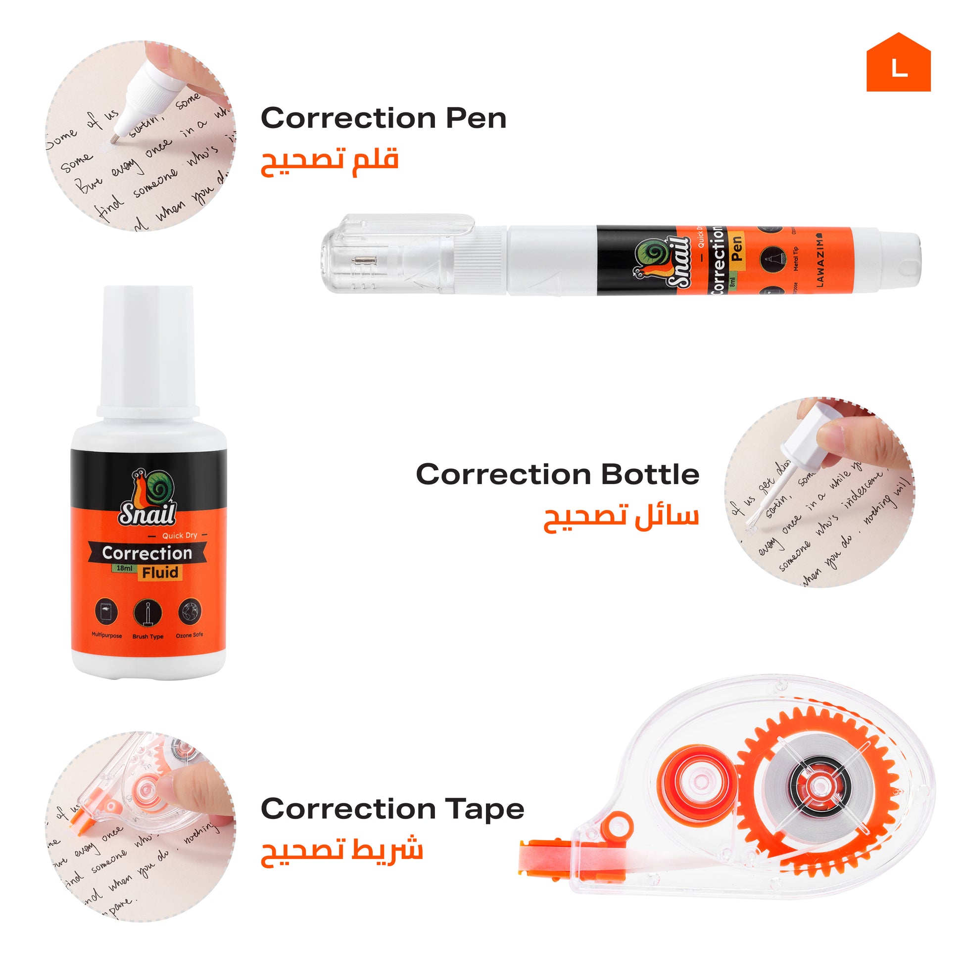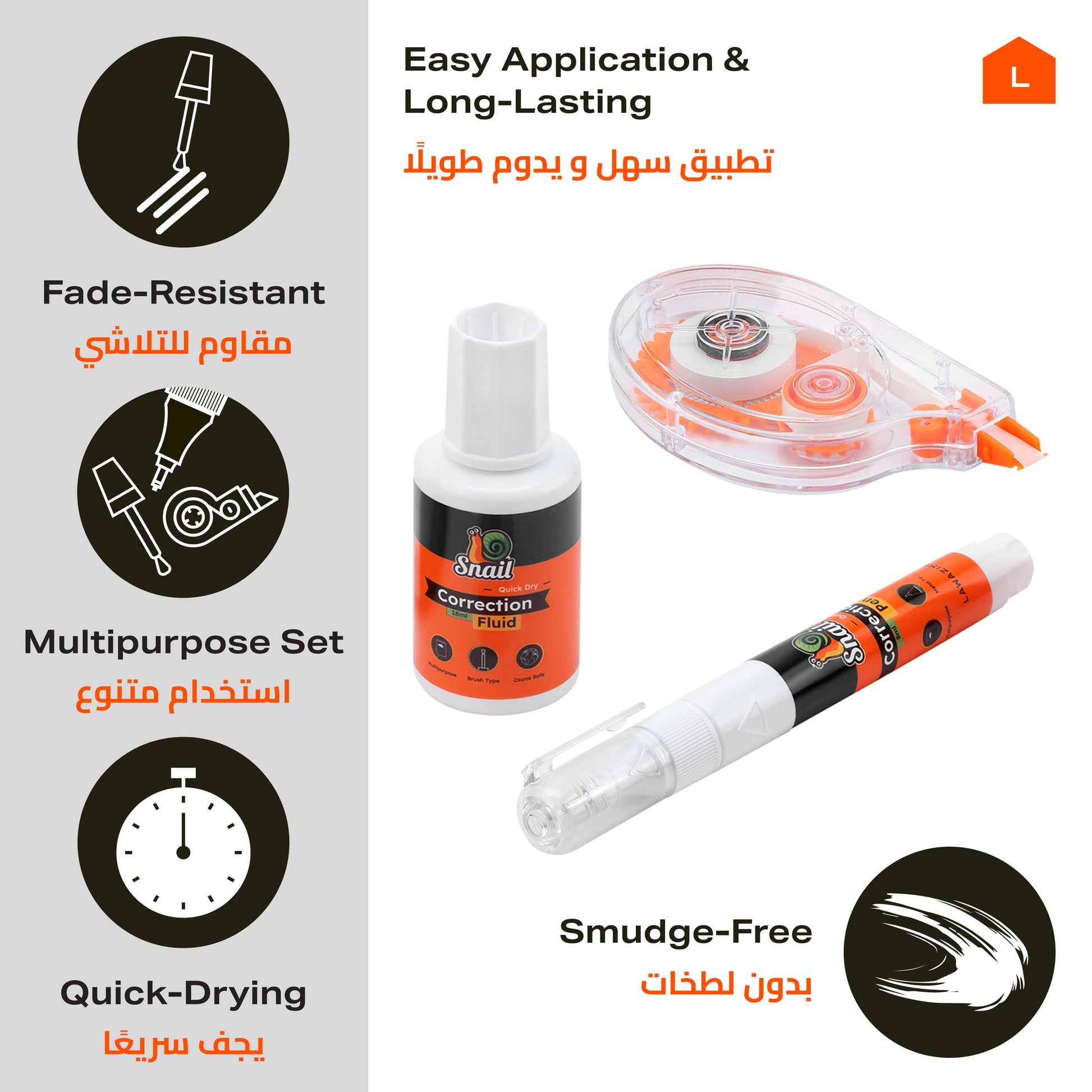 مجموعة تصحيح سريعة الجفاف متعددة الأغراض من Snail - تتضمن قلم تصحيح وسائل تصحيح وشريط تصحيح لتثبيت الورق النظيف في المكتب والمدرسة والاستخدام المنزلي