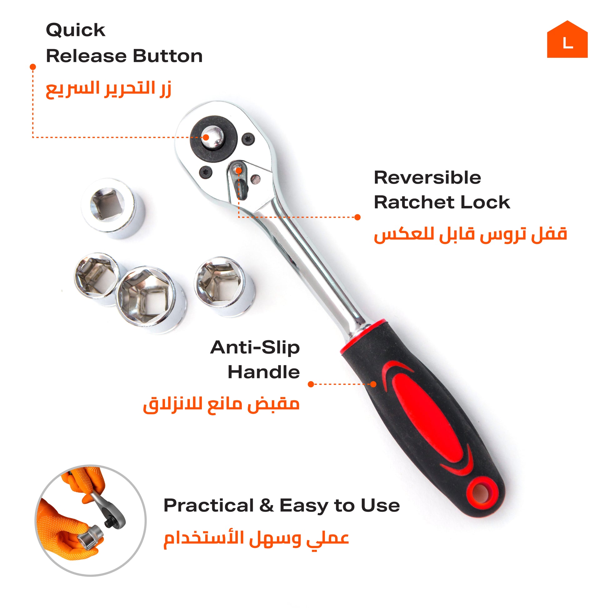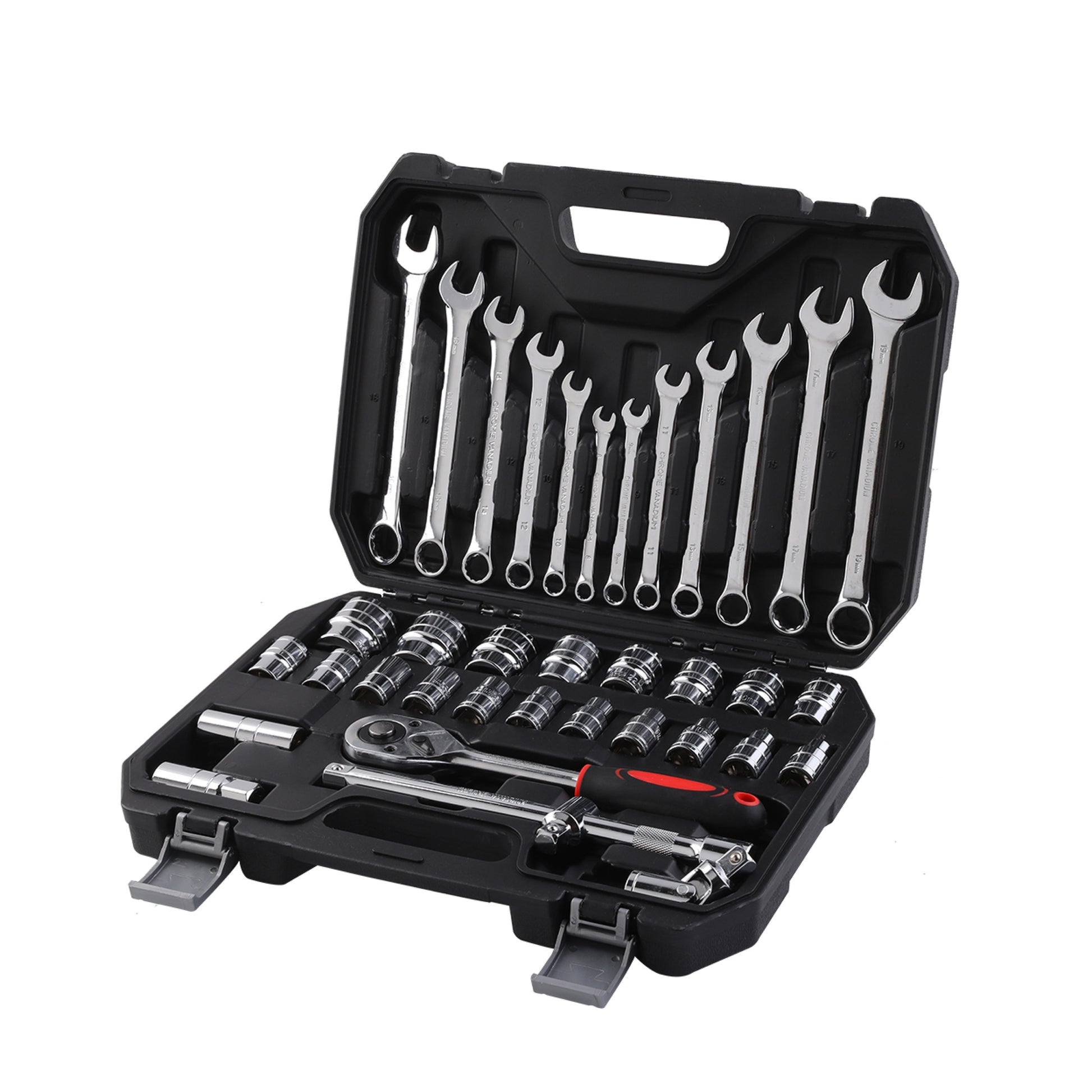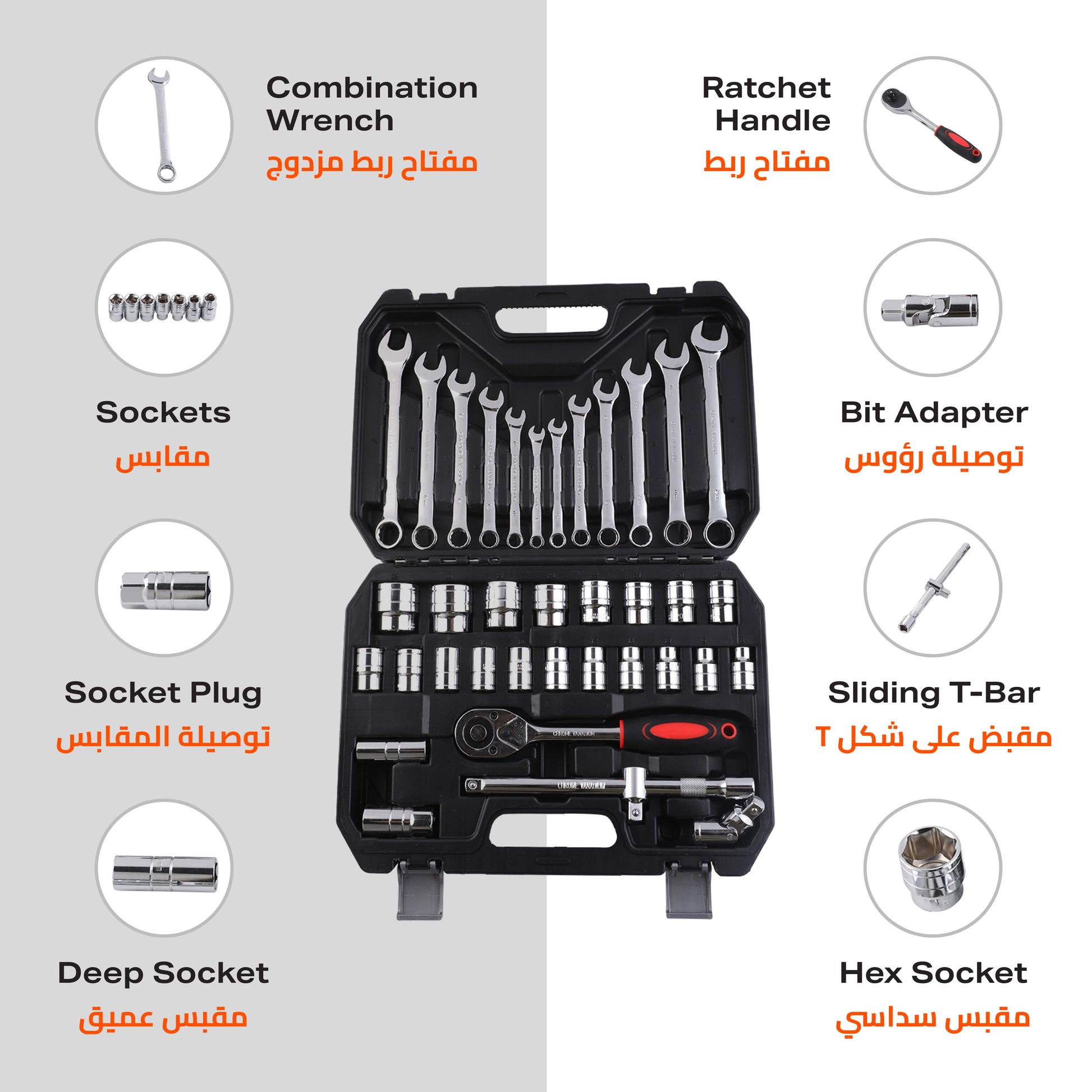 مجموعة أدوات مع حقيبة حمل - 37 قطعة - طقم مقبس ومفتاح ربط بمقبض سقاطة ومقابس سداسية للاستخدام في السيارة والجراج والمنزل