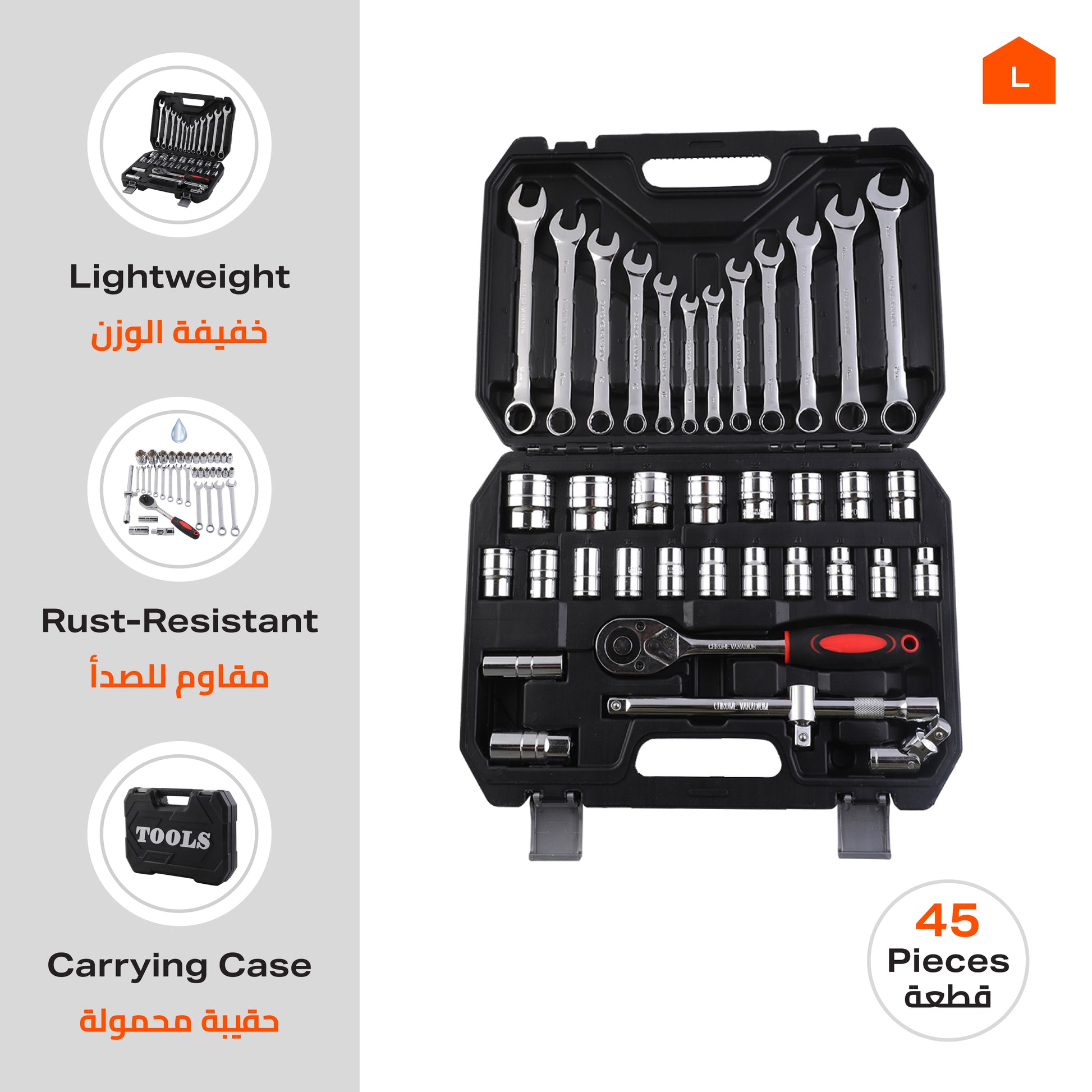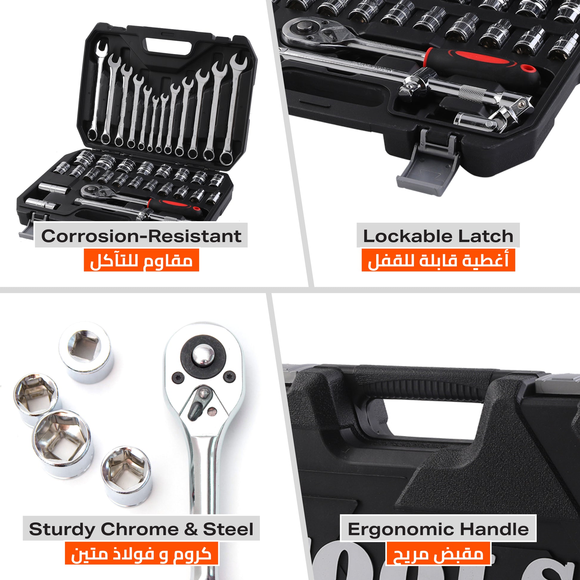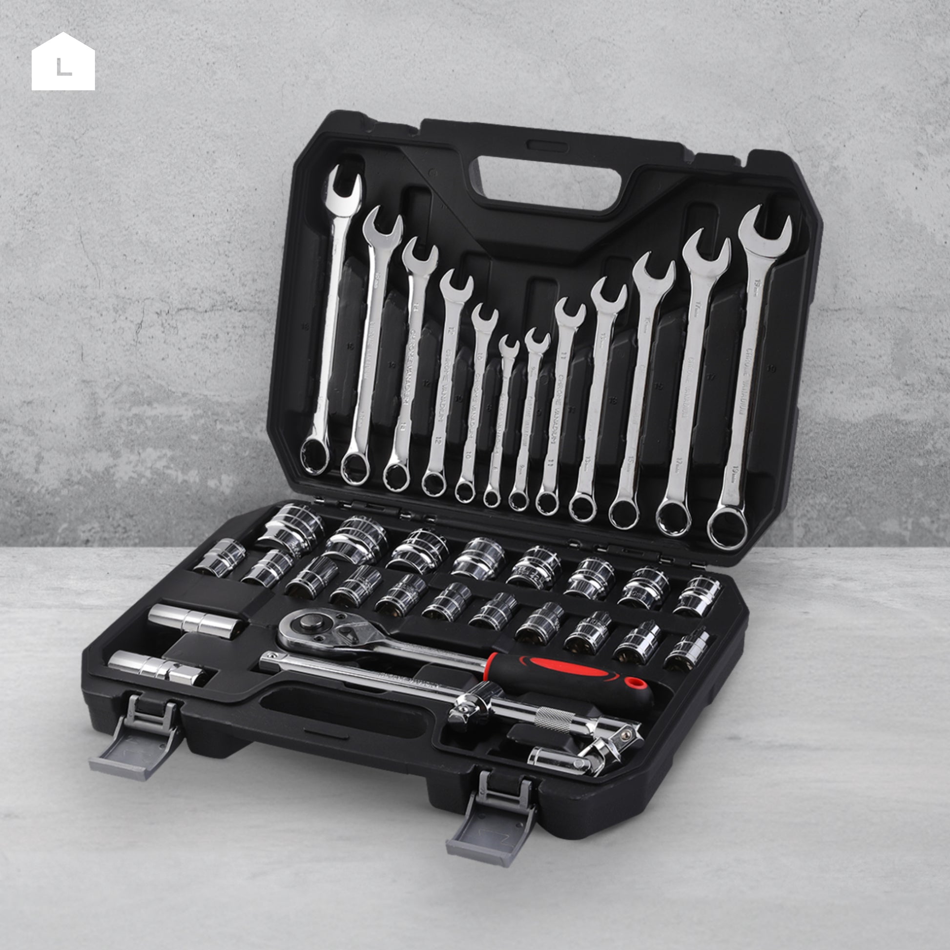 مجموعة أدوات مع حقيبة حمل - 37 قطعة - طقم مقبس ومفتاح ربط بمقبض سقاطة ومقابس سداسية للاستخدام في السيارة والجراج والمنزل