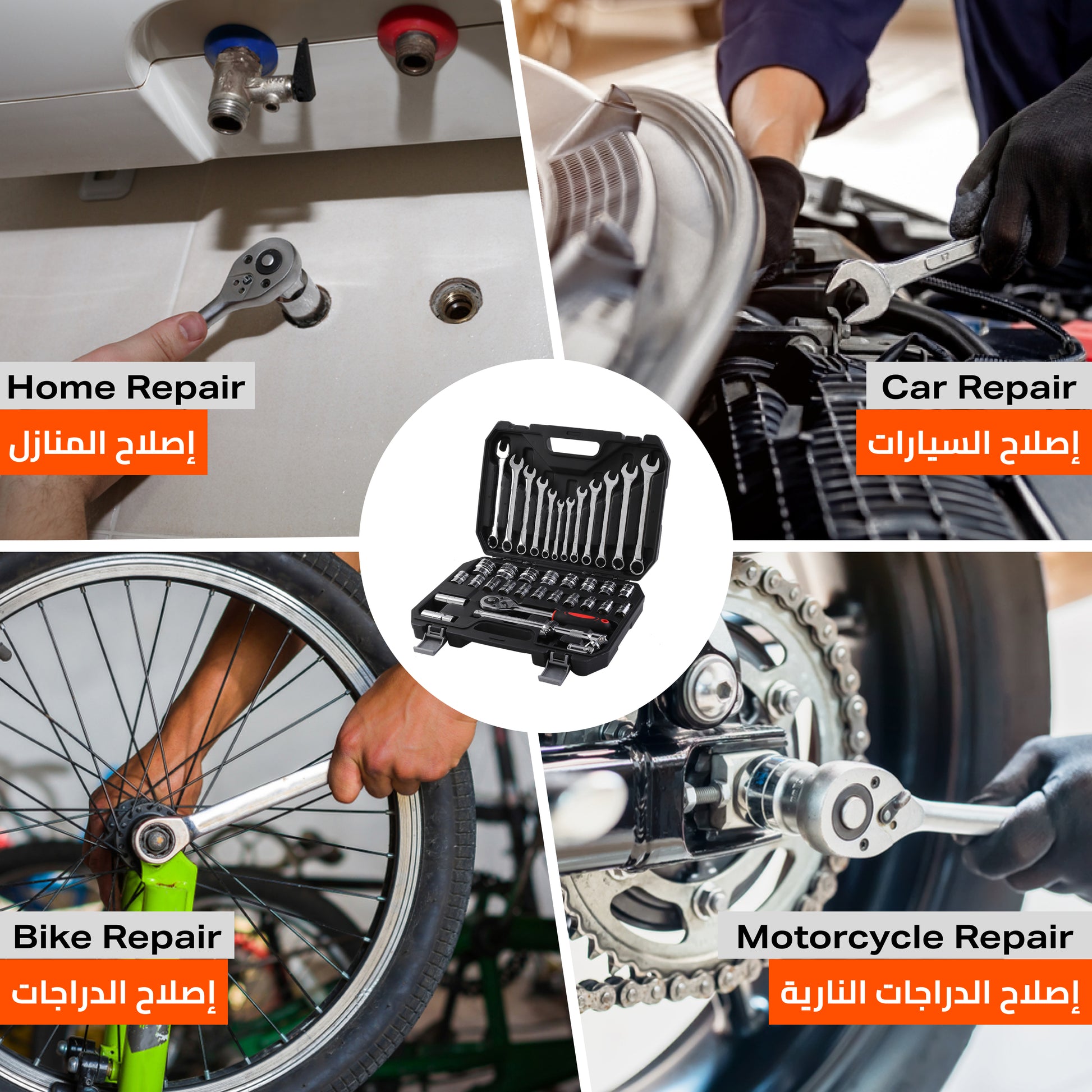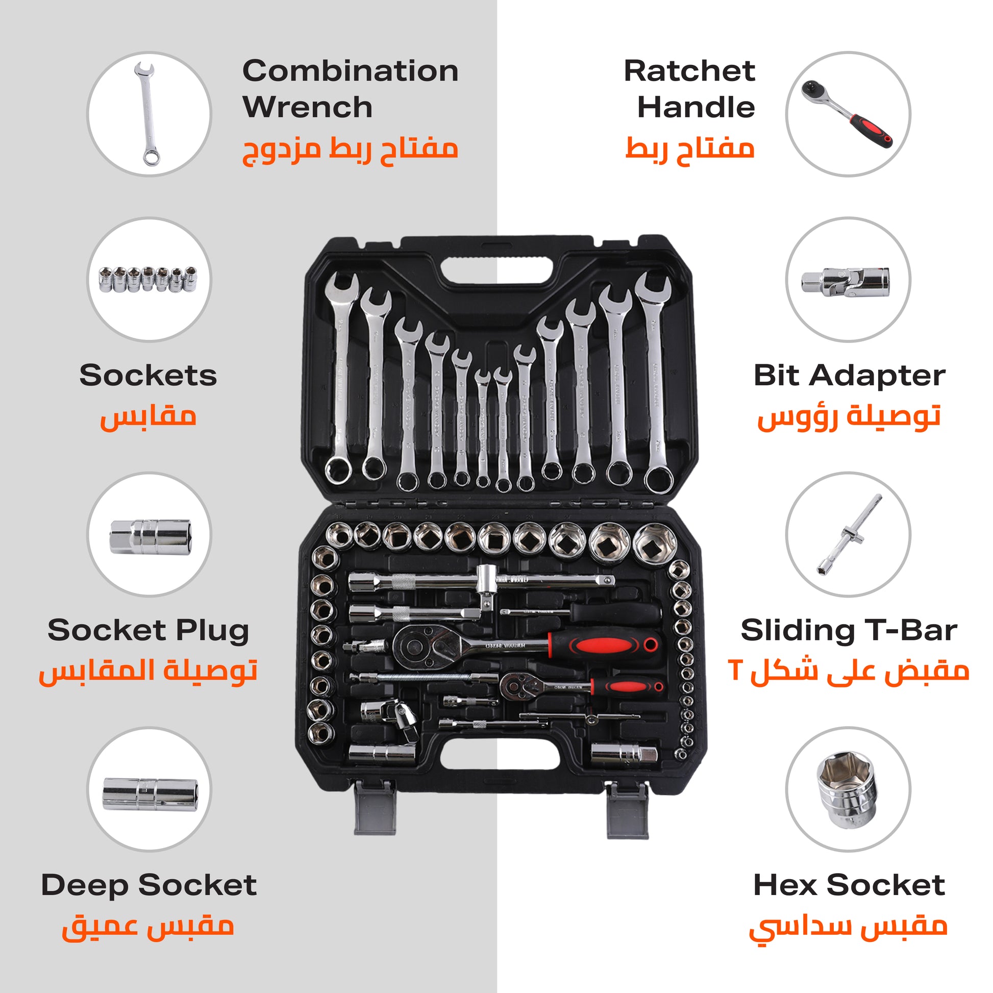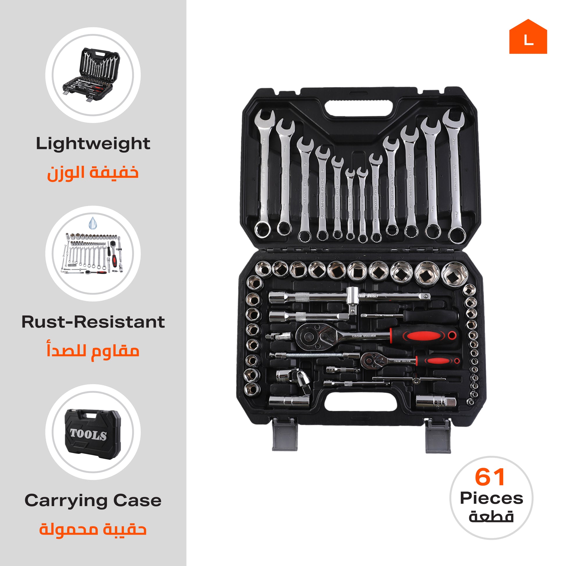 مجموعة أدوات مع حقيبة حمل - 61 قطعة - طقم مقبس ومفتاح ربط بمقبض سقاطة، ومفاتيح ربط مركبة، ومقابس سداسية، وقضيب تمديد لإصلاح المنازل والمرآب والسيارات