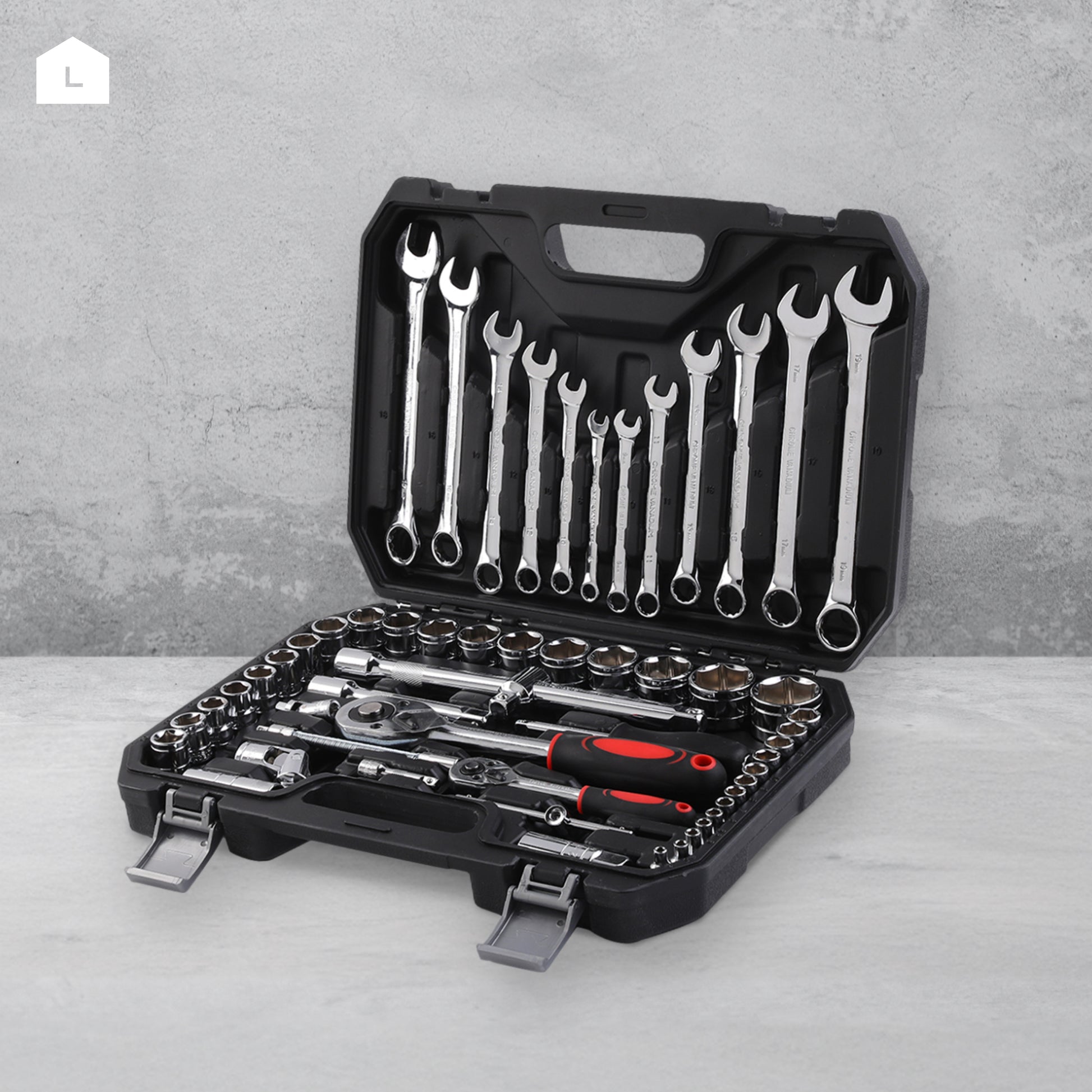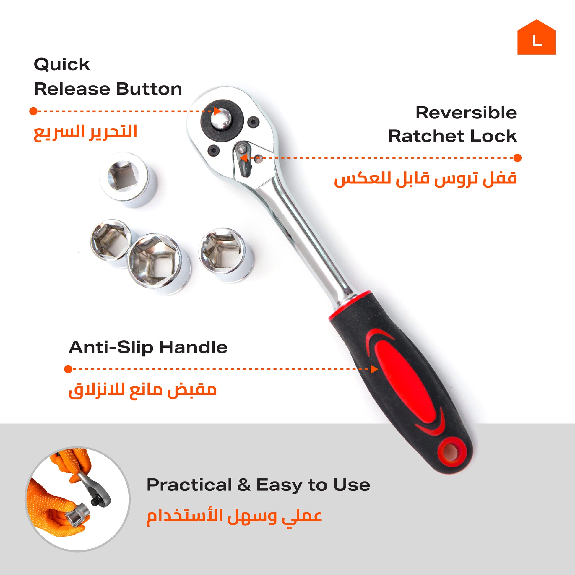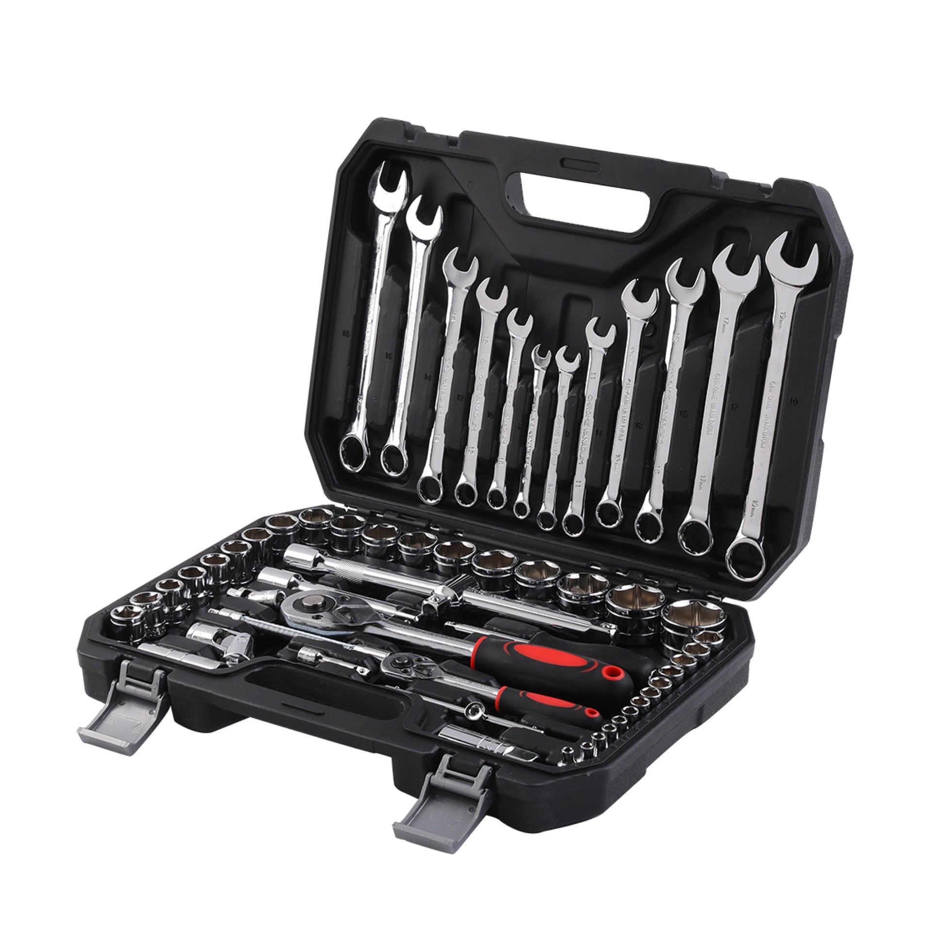 مجموعة أدوات مع حقيبة حمل - 61 قطعة - طقم مقبس ومفتاح ربط بمقبض سقاطة، ومفاتيح ربط مركبة، ومقابس سداسية، وقضيب تمديد لإصلاح المنازل والمرآب والسيارات
