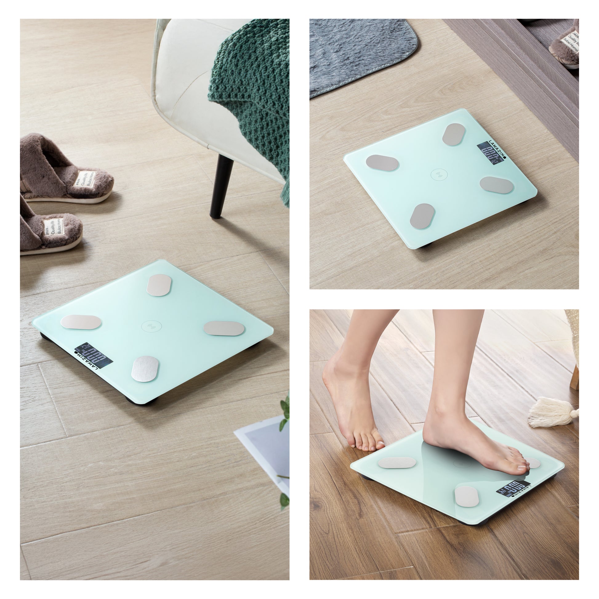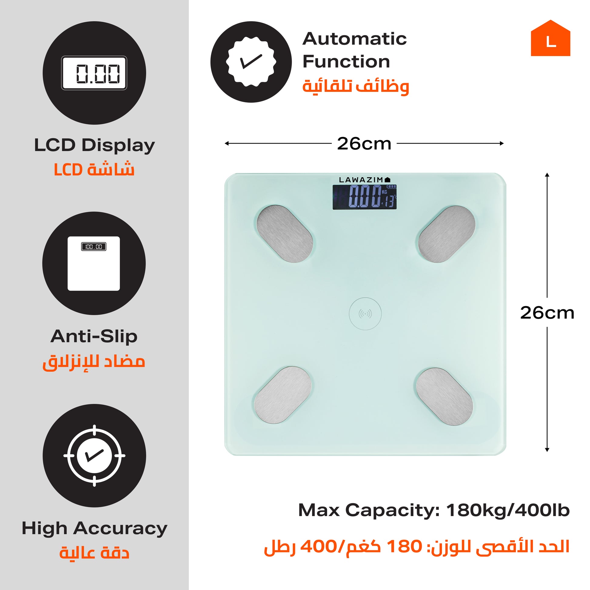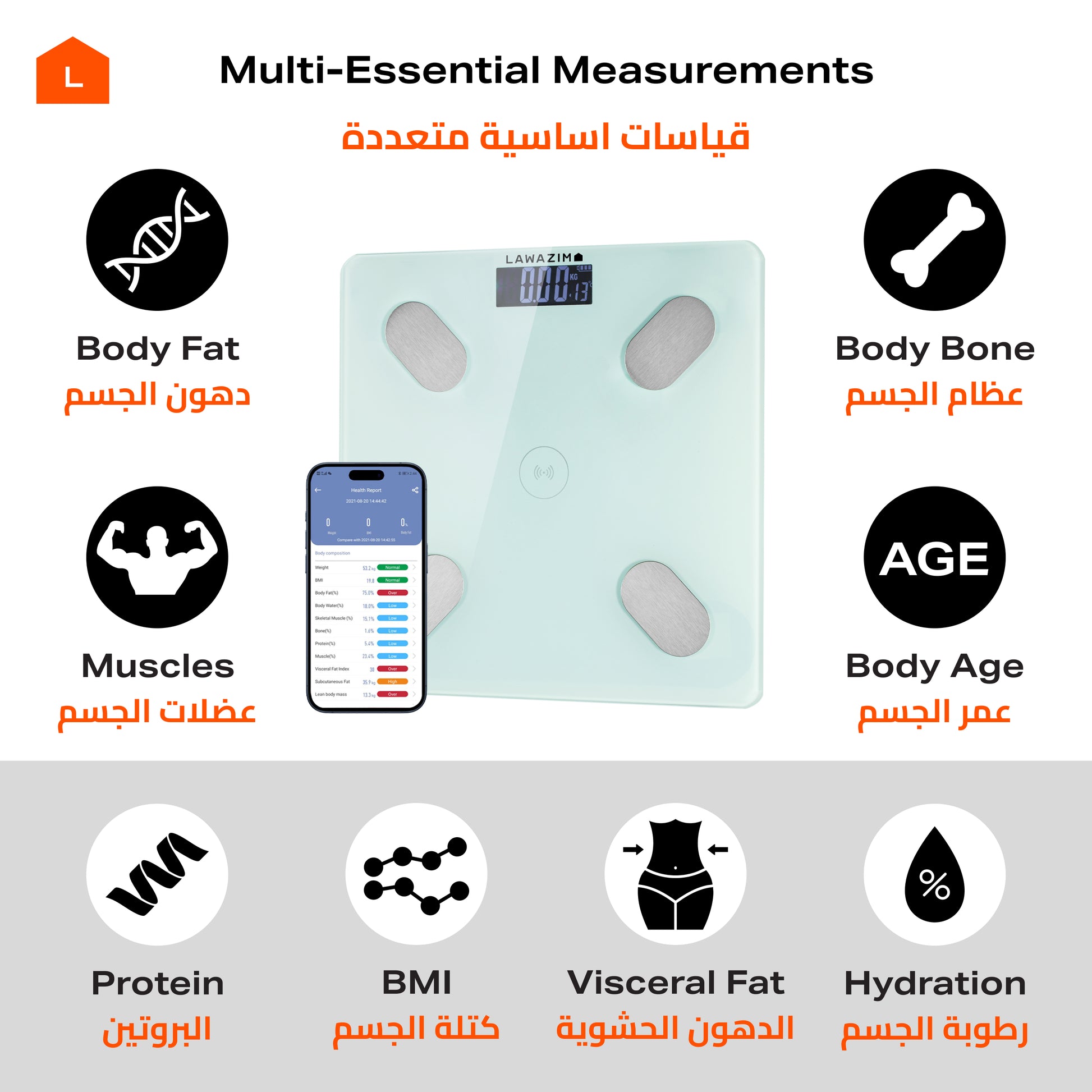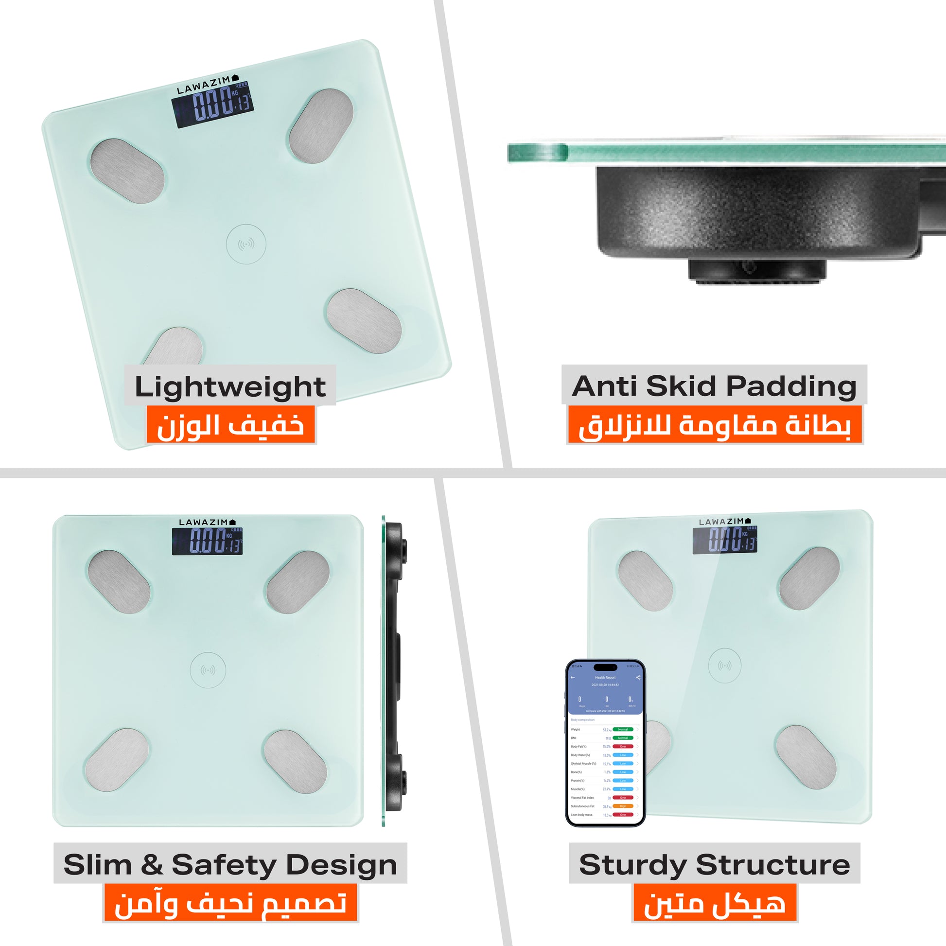 ميزان جسم رقمي مع بلوتوث - ميزان ذكي بمنصة زجاجية لتتبع الصحة، مراقبة اللياقة، وإدارة الوزن