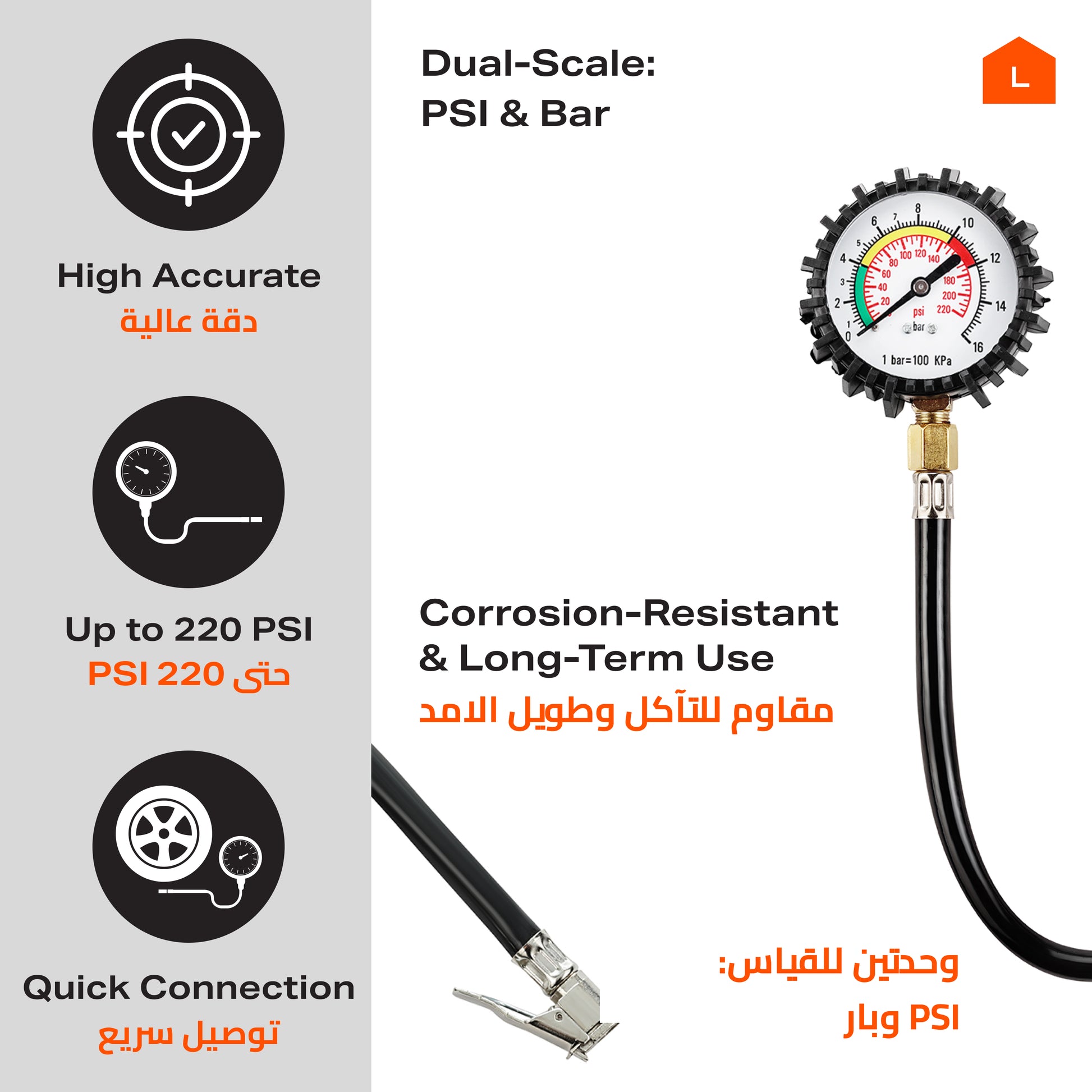 📏 [قراءات دقيقة] يوفّر قراءات دقيقة بوحدتي PSI وbar بمدى يصل حتى 220 PSI و16 bar، مما يضمن الحفاظ على ضغط الإطارات الصحيح لقيادة آمنة وكفاءة أعلى.