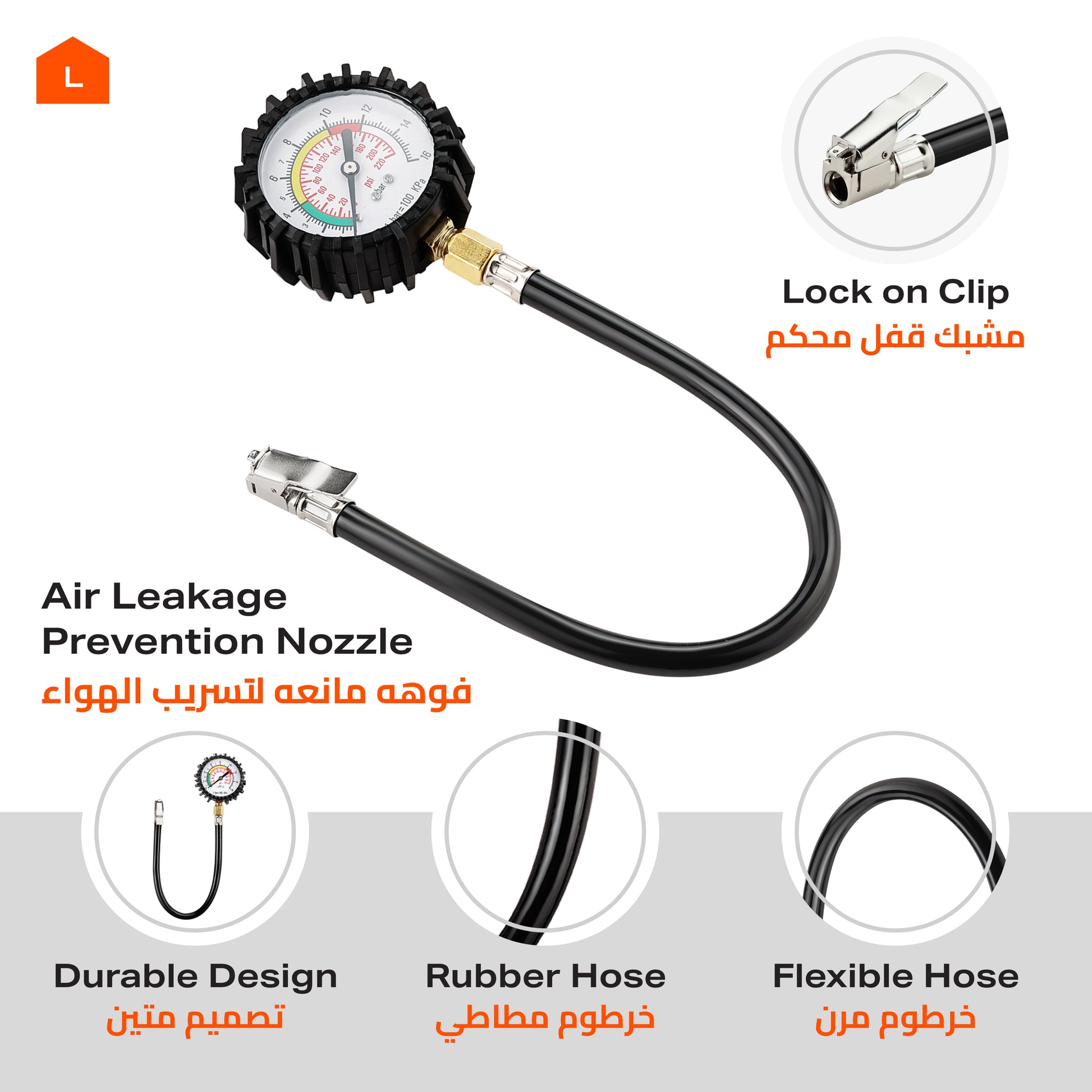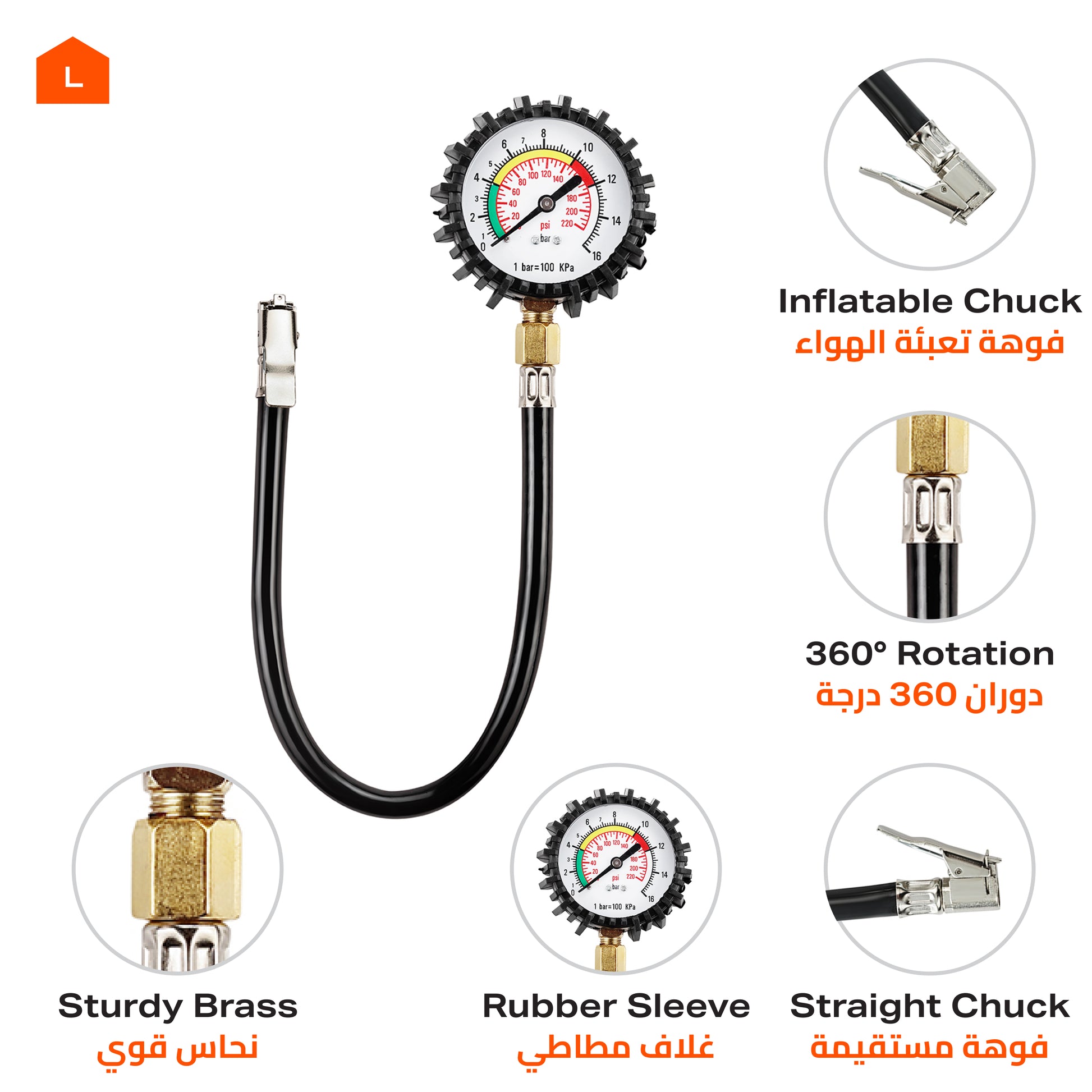 🧵 [خرطوم مطاطي مرن] مزوّد بخرطوم مطاطي عالي المرونة يصل بسهولة إلى صمامات الإطارات حتى في الأماكن الضيقة أو الصعبة، لفحص ضغط مريح وخالٍ من المتاعب.