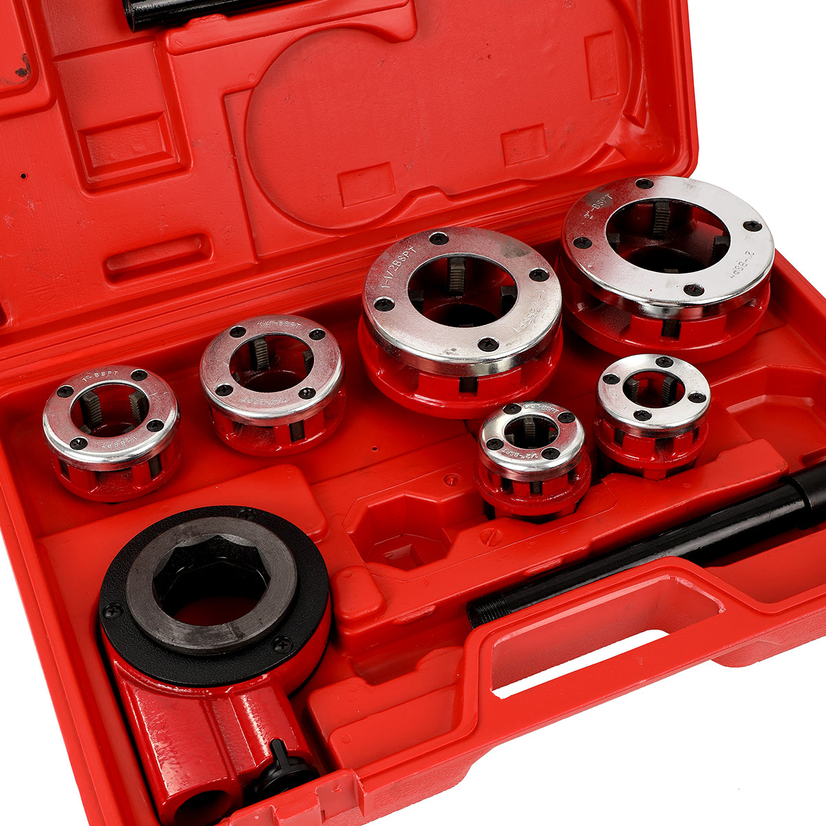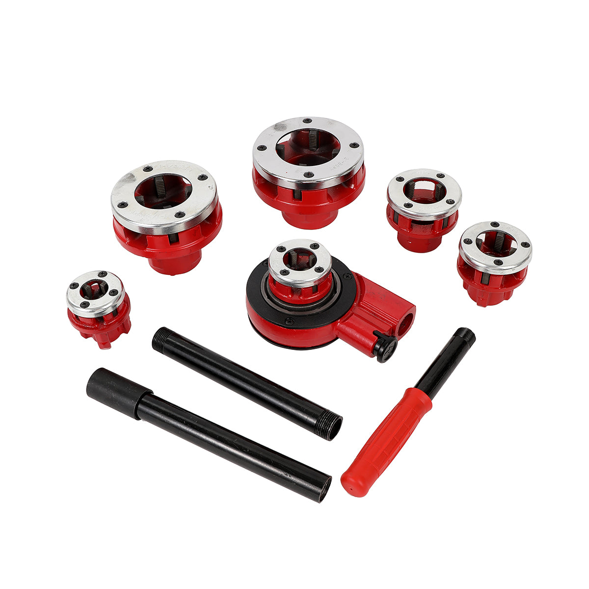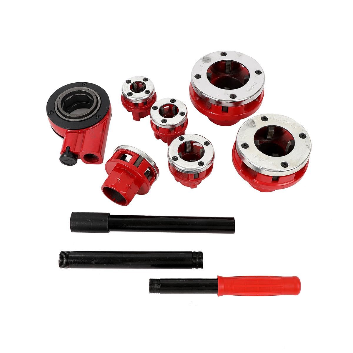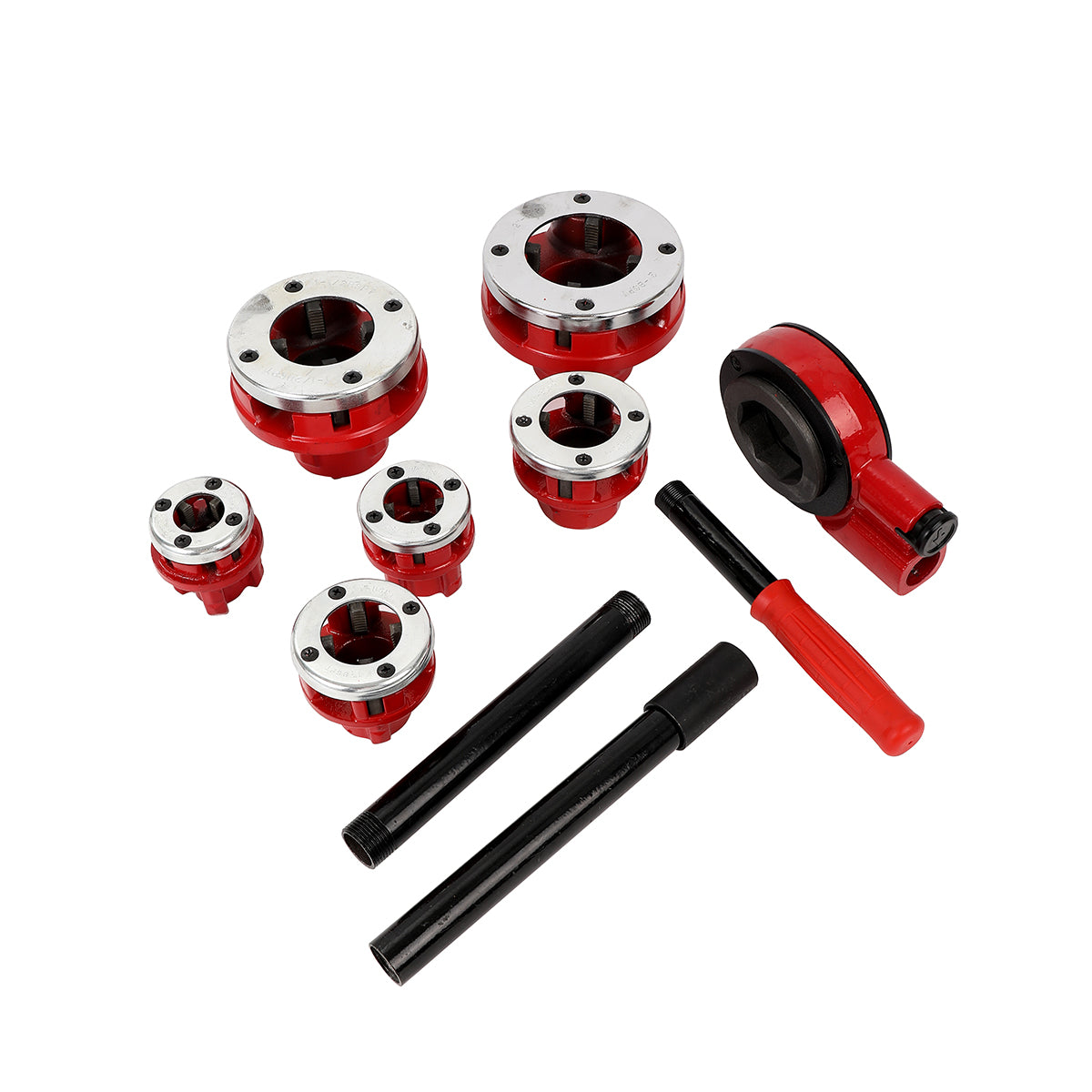 🔧 [Interchangeable] Includes six dies (1/2, 3/4, 1, 1-1/4, 1-1/2, 2 inch) for threading pipes of various diameters.