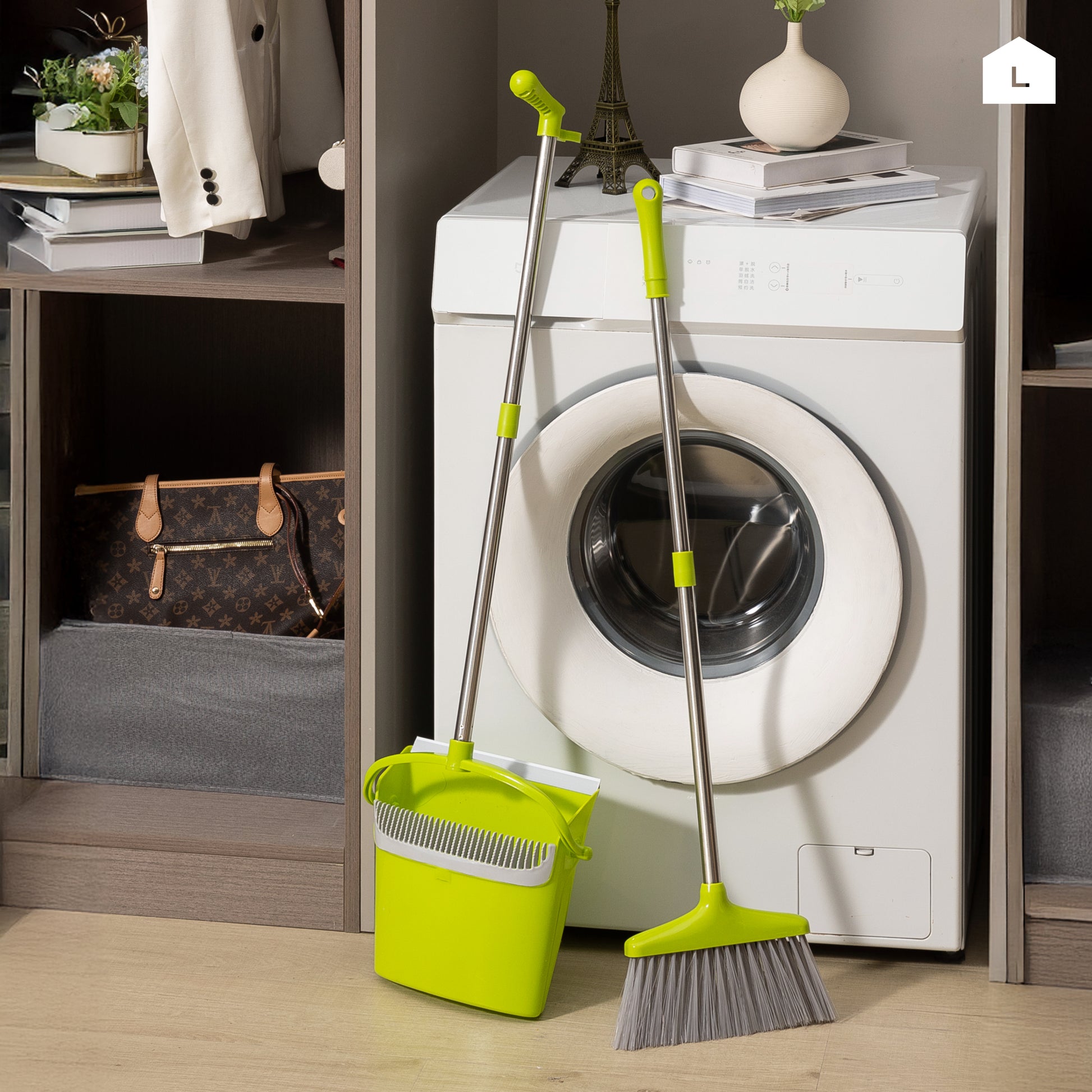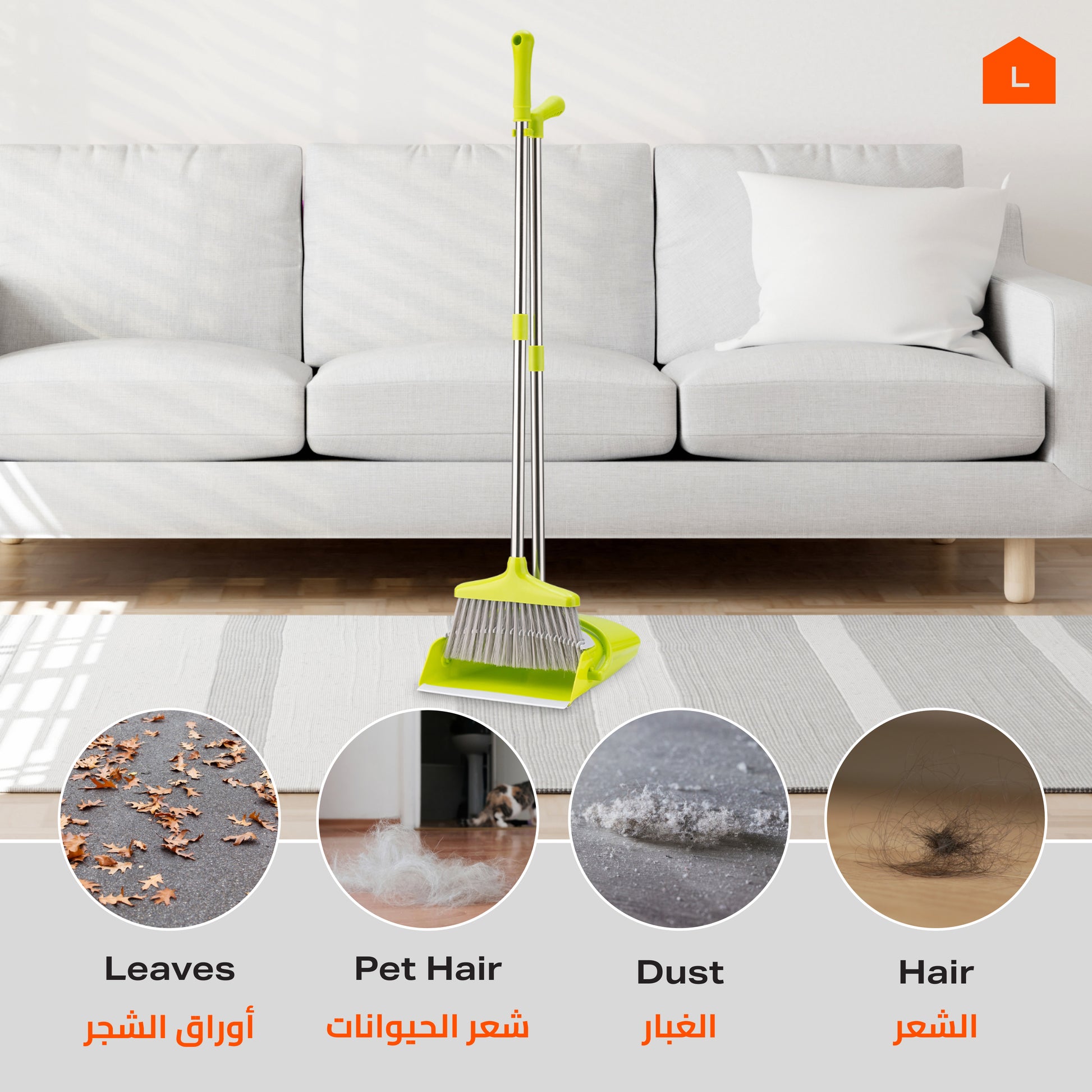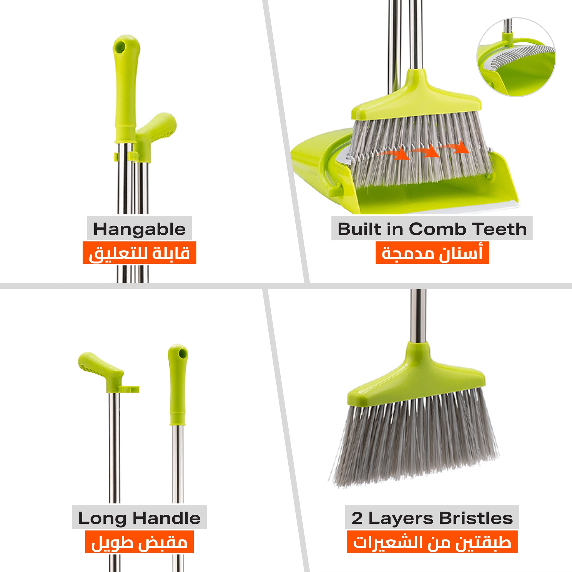 📏 [Compact Storage] Dustpan clips onto the broom handle for upright, space-saving storage in closets or utility areas.